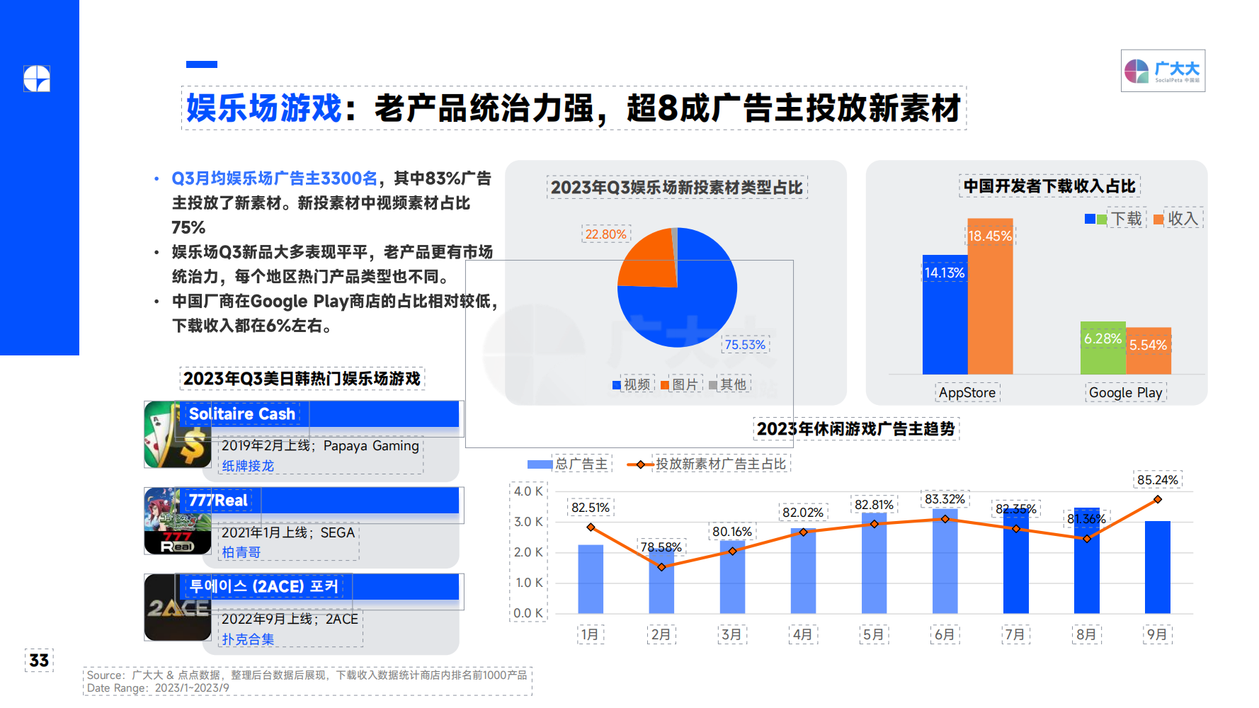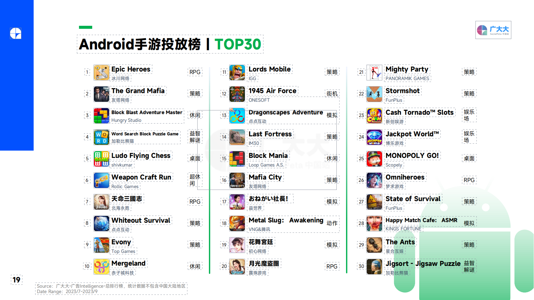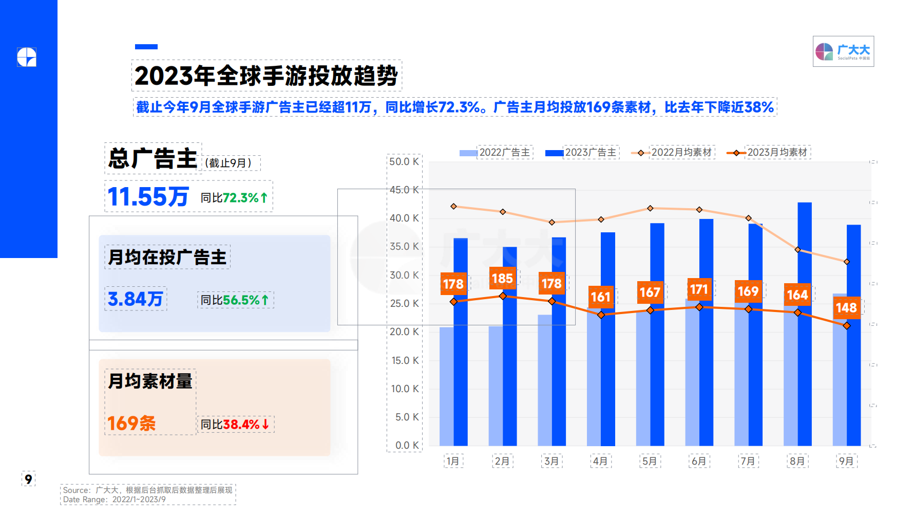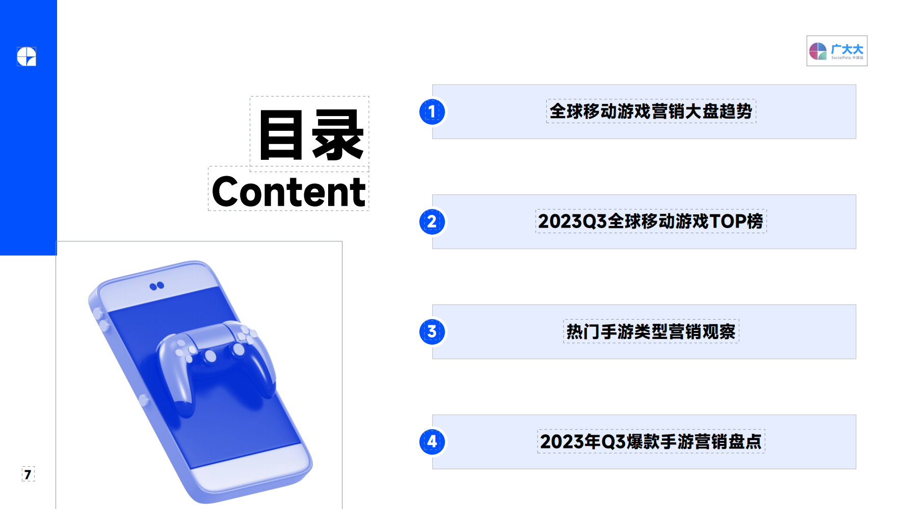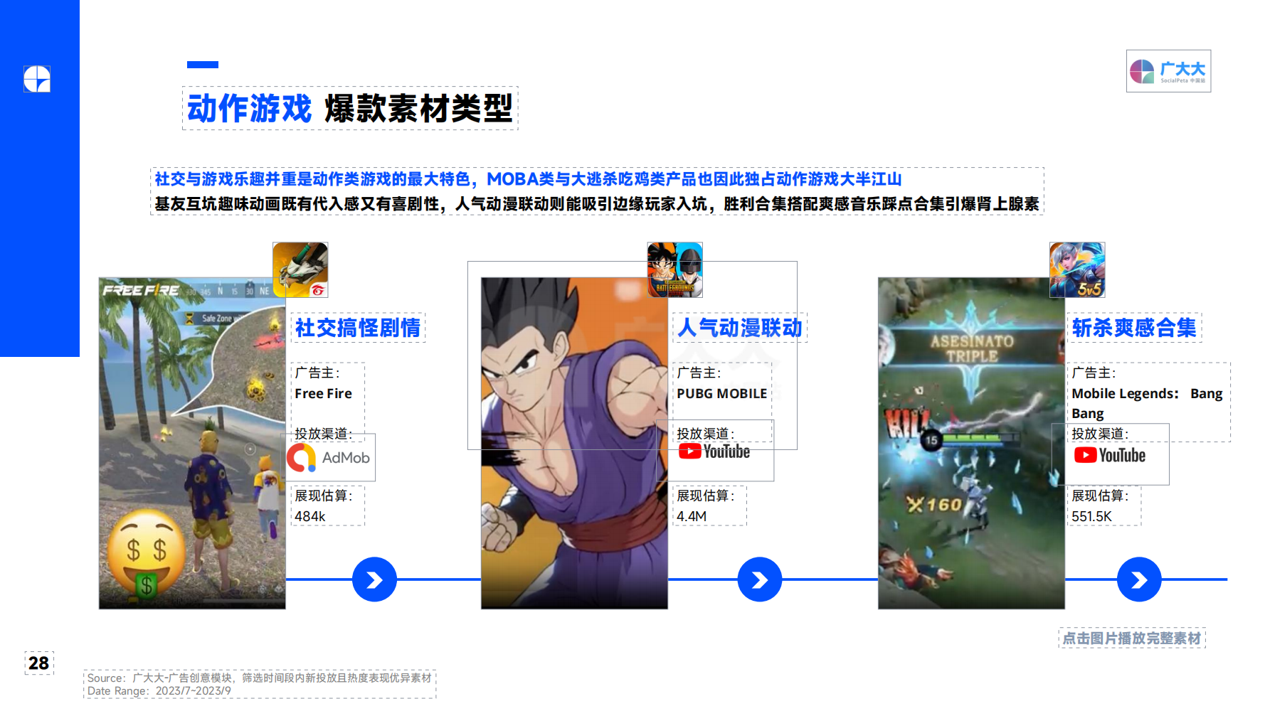 为此,广大大数据研究院联合游戏魔客共同发布《2023Q3 全球移动游戏营销趋势洞察》报告,报告中将深入分析2023年第三季度移动游戏市场的核心动态,从投放买量、素材风向、出海厂商下载/收入占比、新游营销回盘等方面对于游戏市场进行系统性地分析与归因,为游戏开发者、素材优化师、游戏厂商们提供最新最全的出海游戏营销地图。