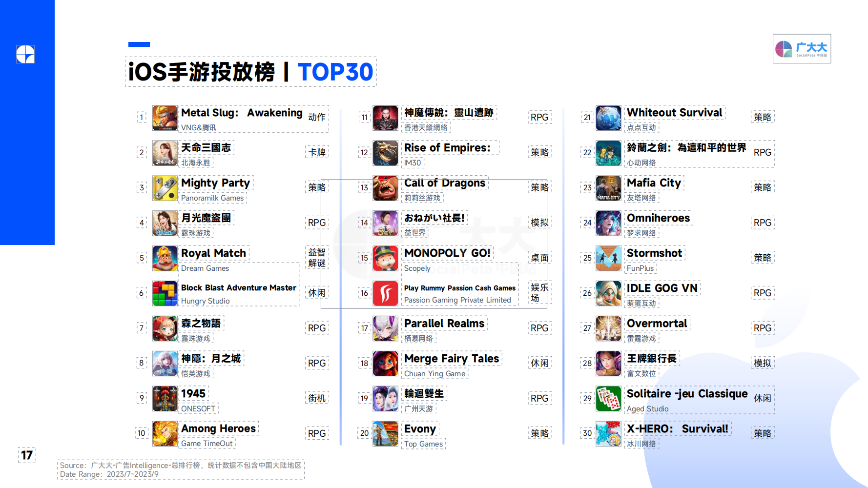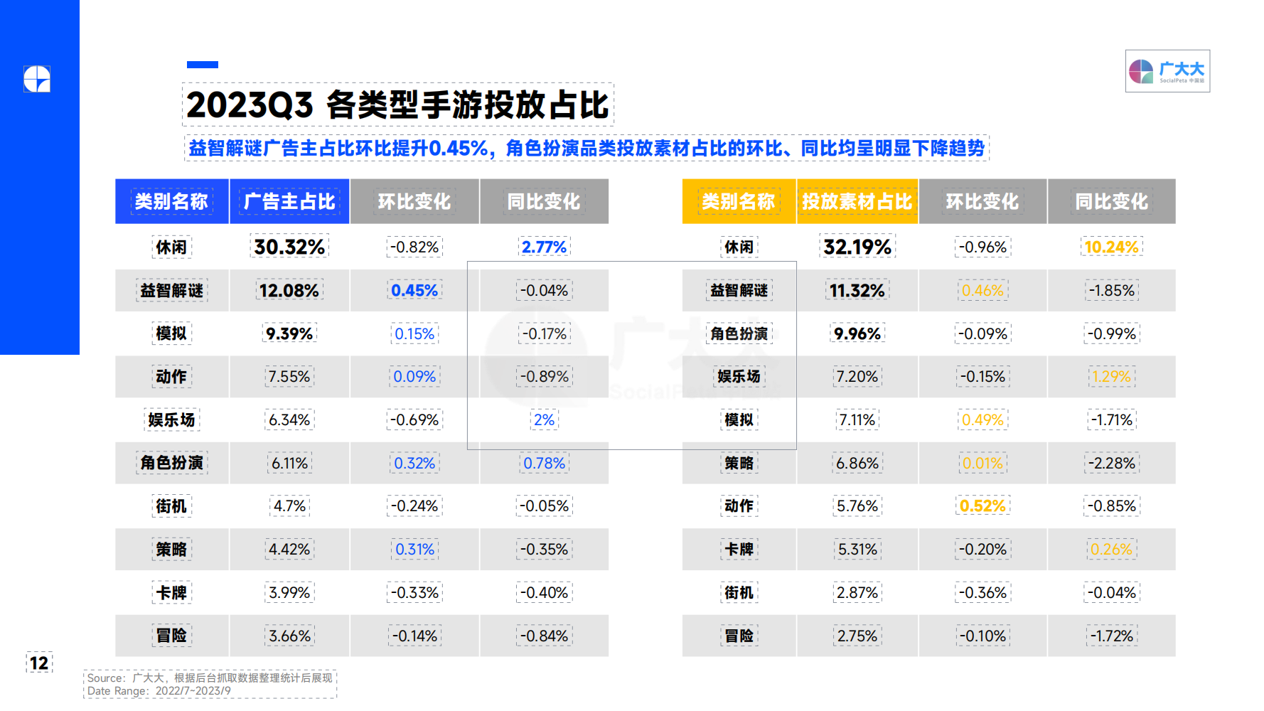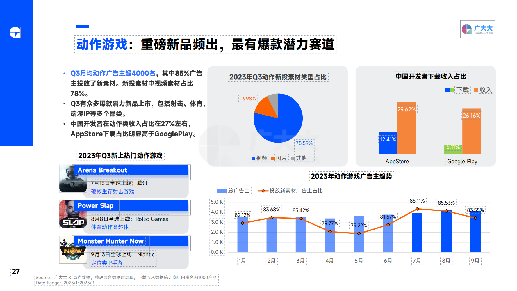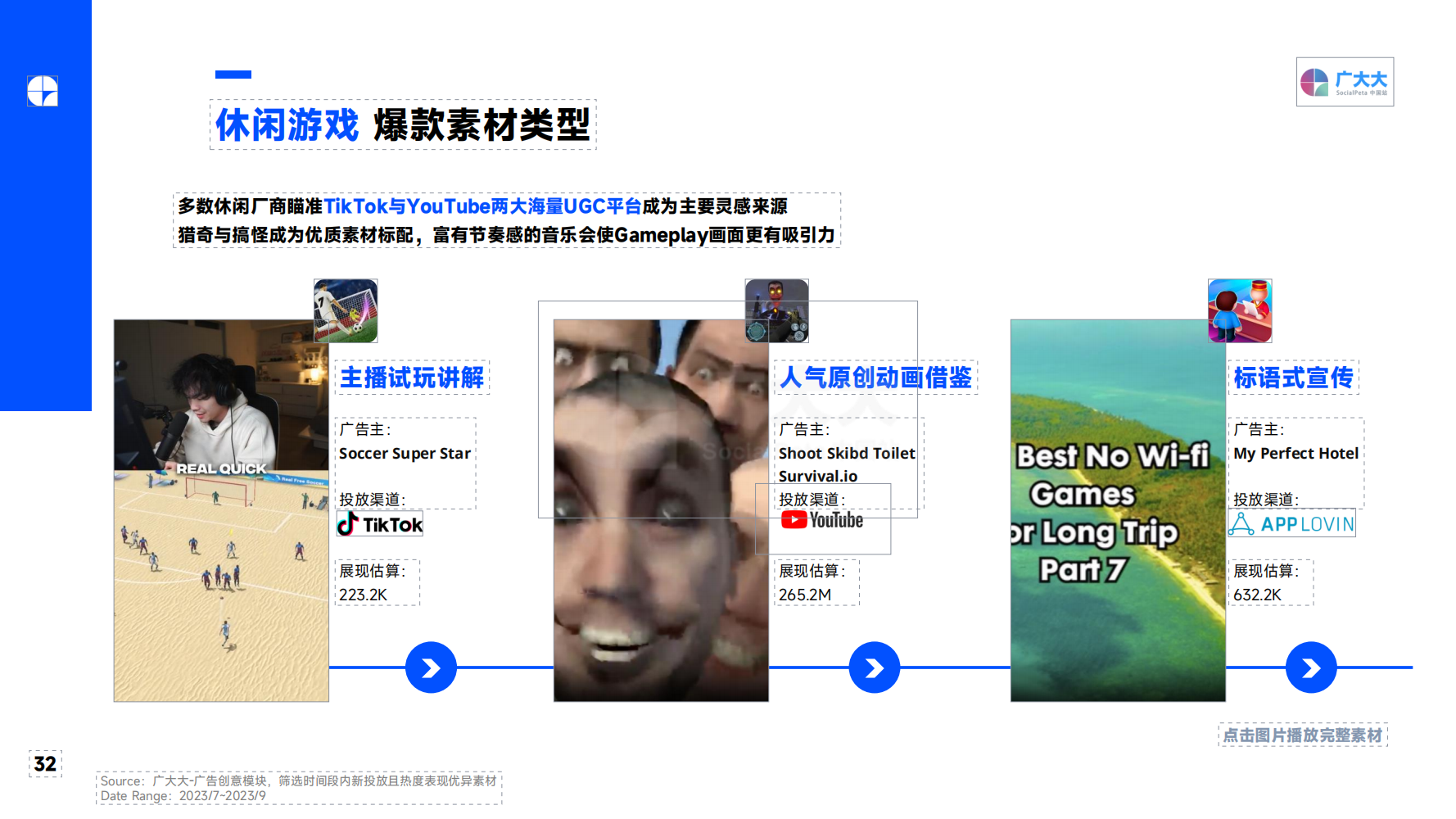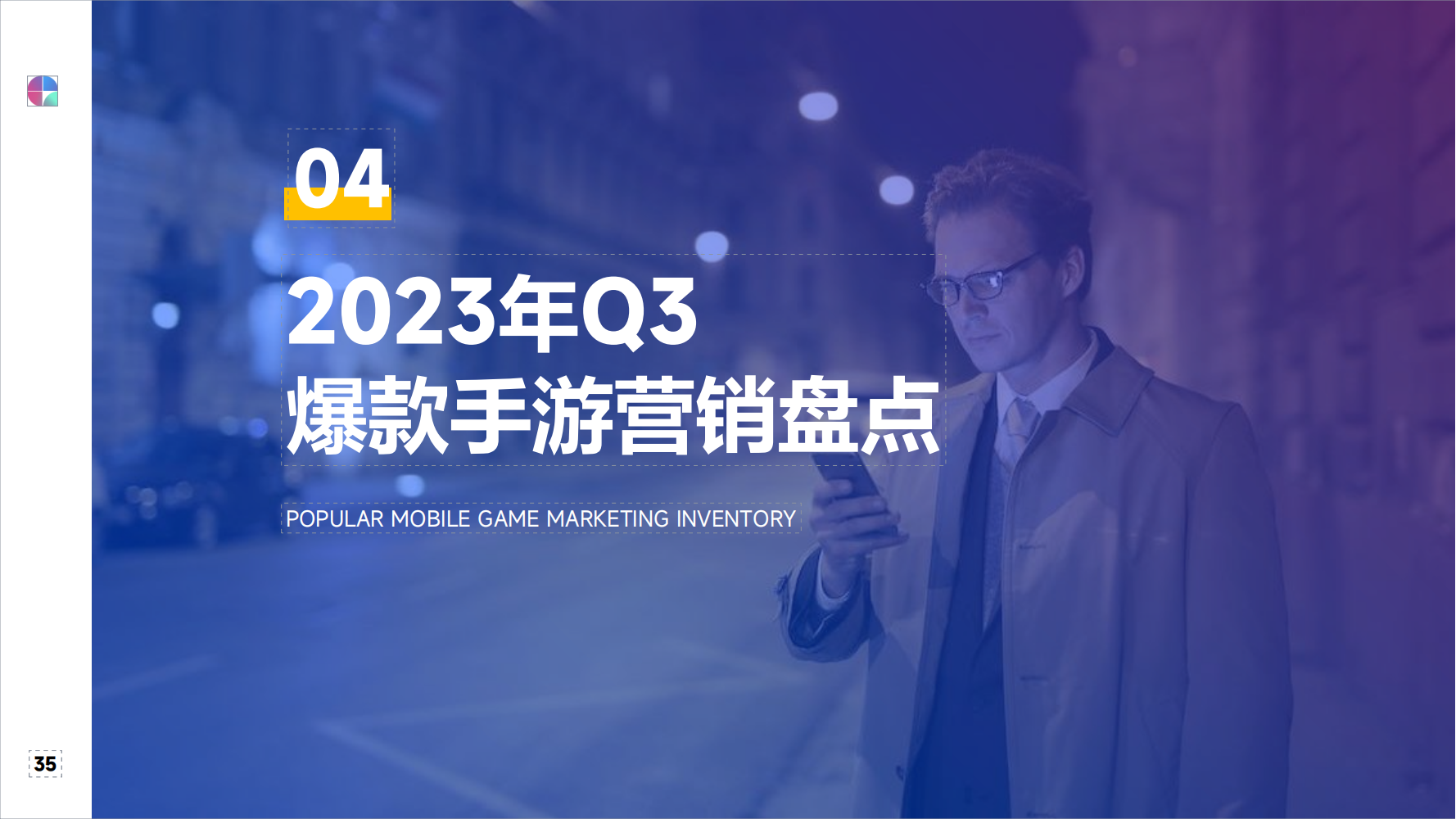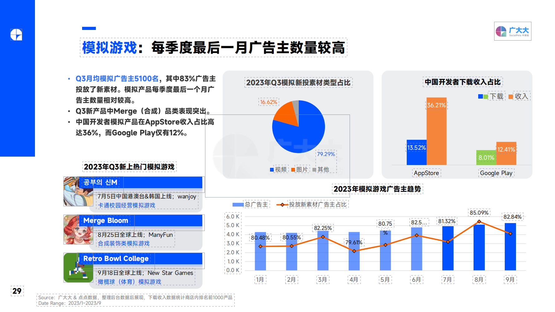 为此,广大大数据研究院联合游戏魔客共同发布《2023Q3 全球移动游戏营销趋势洞察》报告,报告中将深入分析2023年第三季度移动游戏市场的核心动态,从投放买量、素材风向、出海厂商下载/收入占比、新游营销回盘等方面对于游戏市场进行系统性地分析与归因,为游戏开发者、素材优化师、游戏厂商们提供最新最全的出海游戏营销地图。
