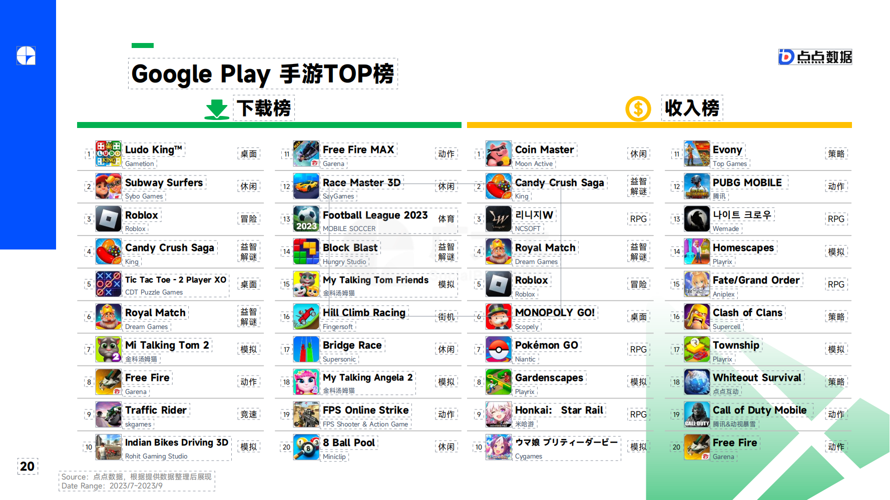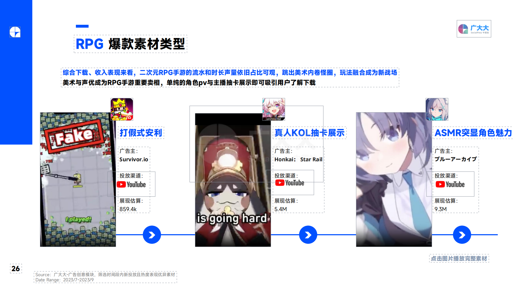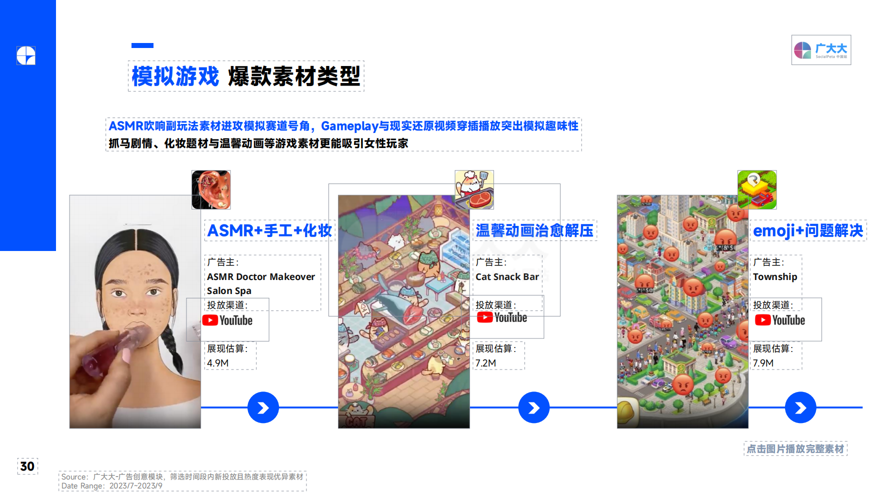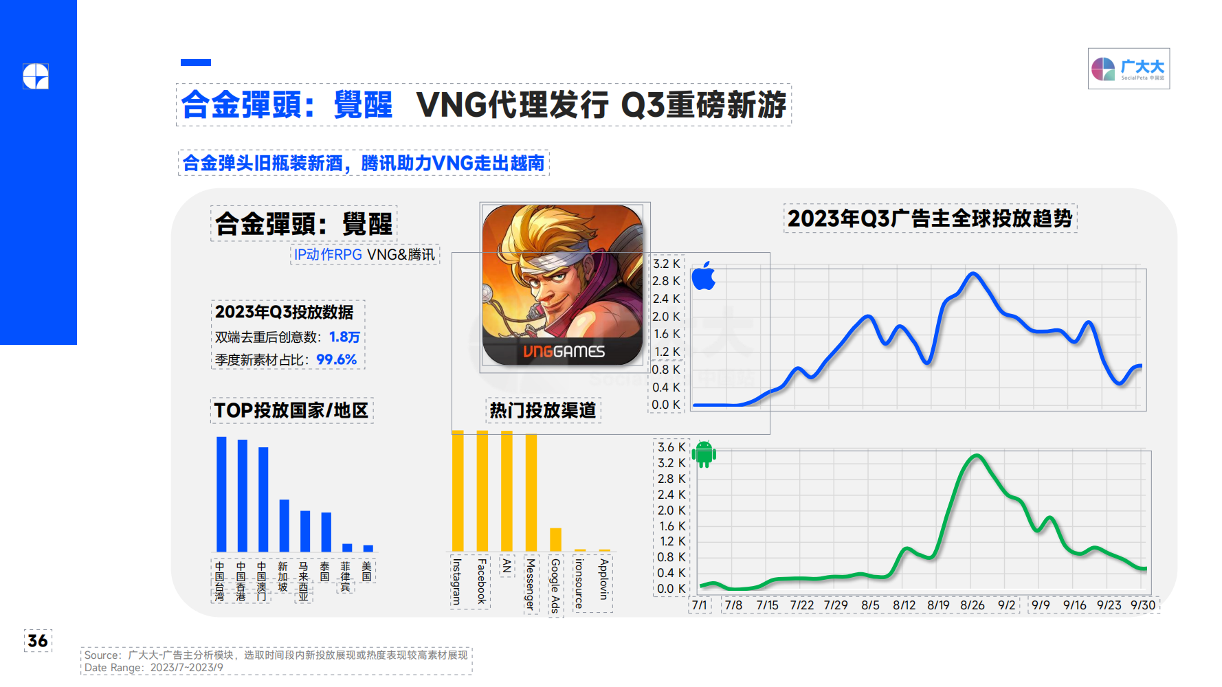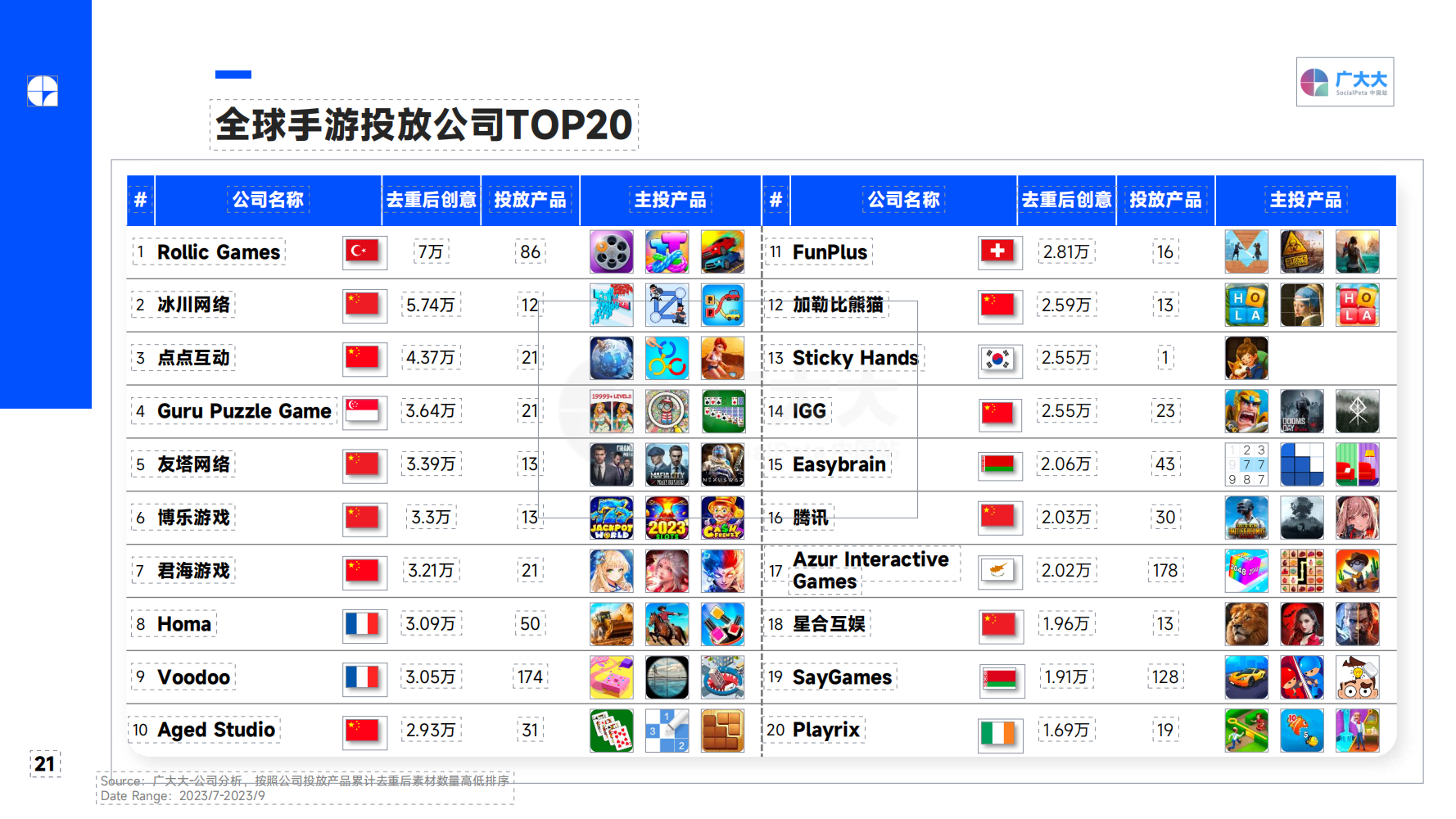 为此,广大大数据研究院联合游戏魔客共同发布《2023Q3 全球移动游戏营销趋势洞察》报告,报告中将深入分析2023年第三季度移动游戏市场的核心动态,从投放买量、素材风向、出海厂商下载/收入占比、新游营销回盘等方面对于游戏市场进行系统性地分析与归因,为游戏开发者、素材优化师、游戏厂商们提供最新最全的出海游戏营销地图。