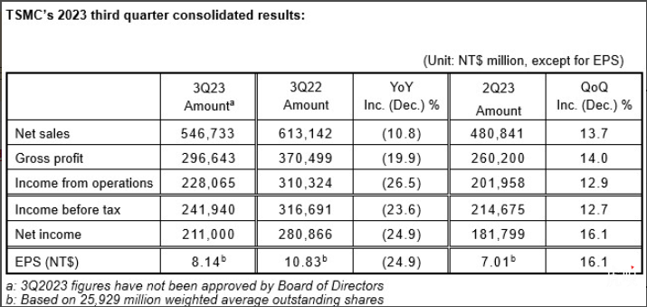 根据财报数据,第三季度台积电净营收5467.3亿元新台币,同比下降10.8%,环比增长13.7%;第三季度净利润2108亿元新台币,同比下降25.0%,环比增长 16.0%。
