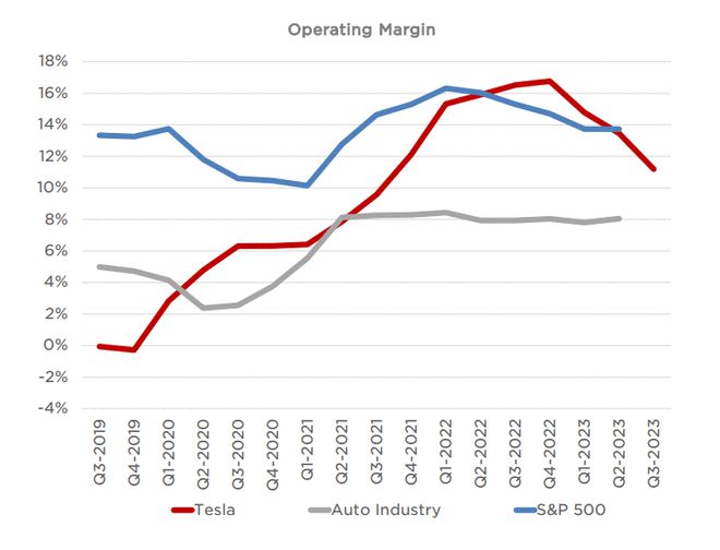特斯拉第三季度总毛利同比下降22%,略低于分析师预期。这是因为公司在利率上升的情况下大幅降价以刺激需求。特斯拉第三季度的平均单车收入较去年同期下降了近11%。