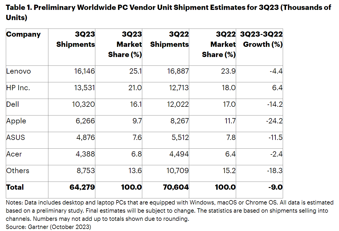 根据Gartner的最新结果,2023年第三季度全球PC出货量总计达到6430万台,比2022年第三季度下降9%。尽管第三季度的结果标志着全球PC市场连续第八个季度下滑,但Gartner预计,从今年第四季度开始,全球PC市场将再次出现增长。