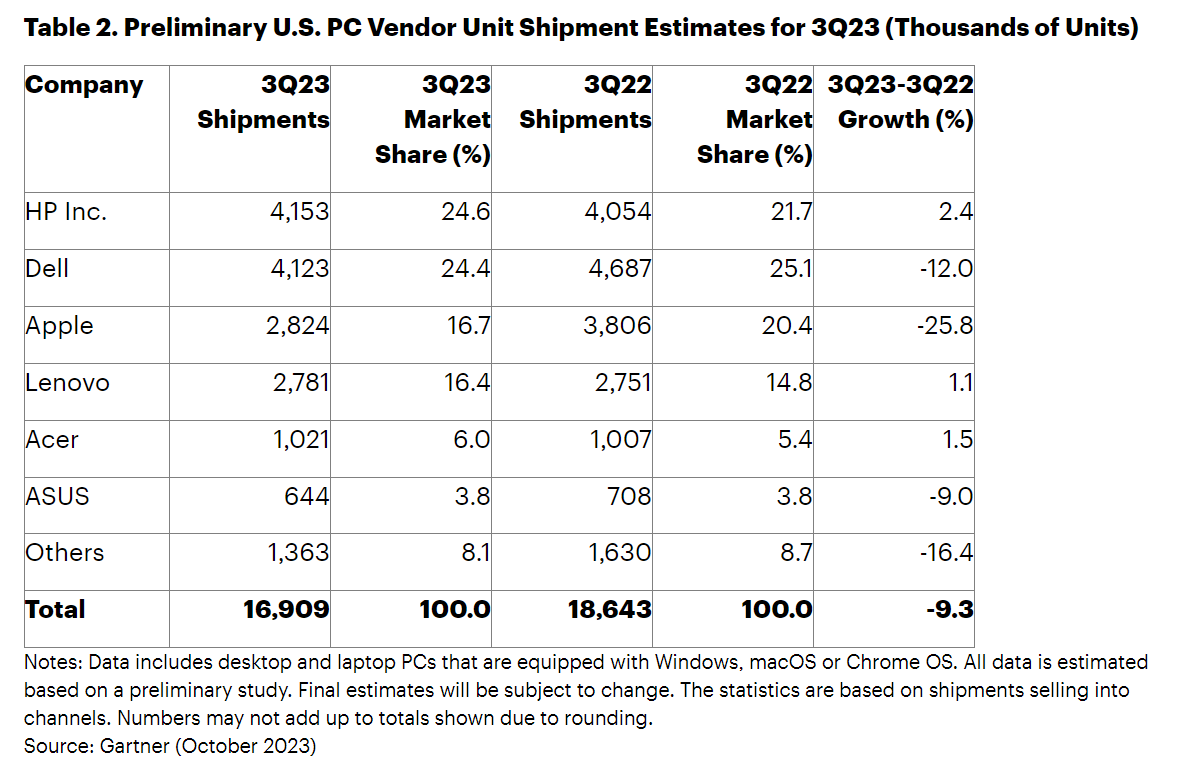 2023年第三季度,全球PC市场的顶级供应商保持不变,联想以25.1%的市场份额保持出货量第一的位置。