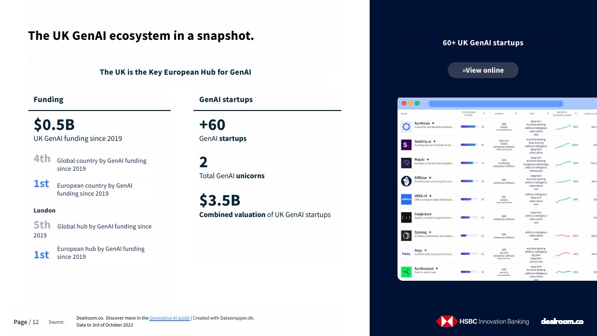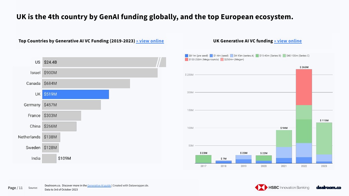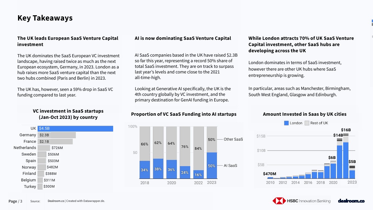 今年到目前为止,总部位于英国的人工智能SaaS公司已经获得了23亿美元,占SaaS总投资的50%,创历史新高。它有望超过去年的水平,接近2021年的历史最高水平。就生成式人工智能而言,英国是全球第四大风险投资中心,也是欧洲GenAI投资的主要目的地。