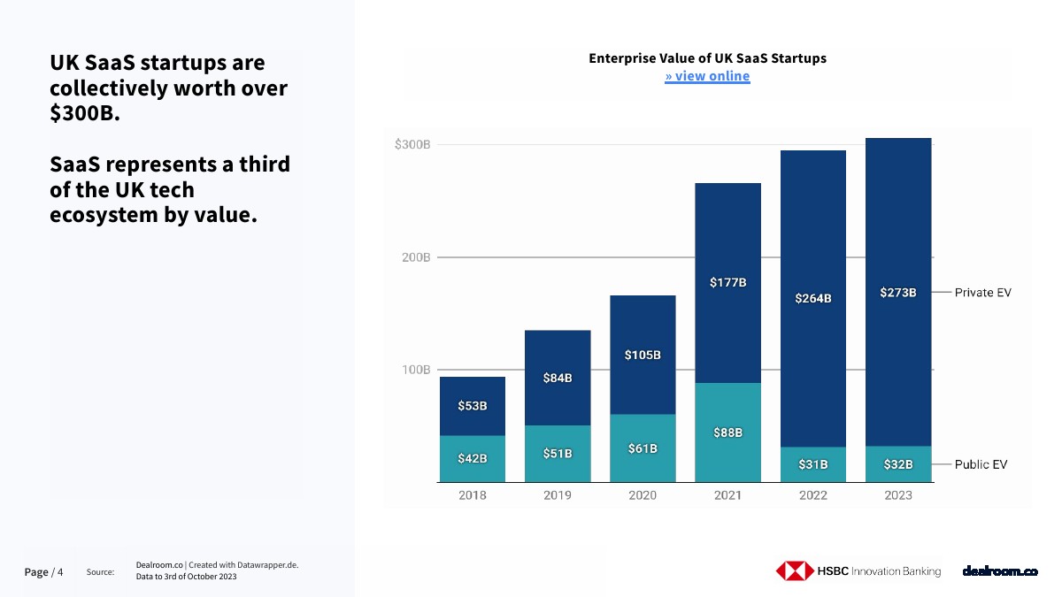英国SaaS初创公司的总市值超过3000亿美元。按价值计算,SaaS占英国科技生态系统的1/3。