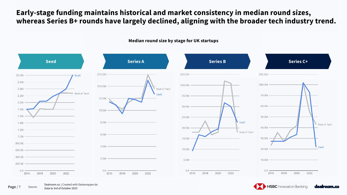 早期交易的中位数保持了历史和市场的一致性,而B+轮投资则大幅下降,这与科技行业的整体趋势一致。