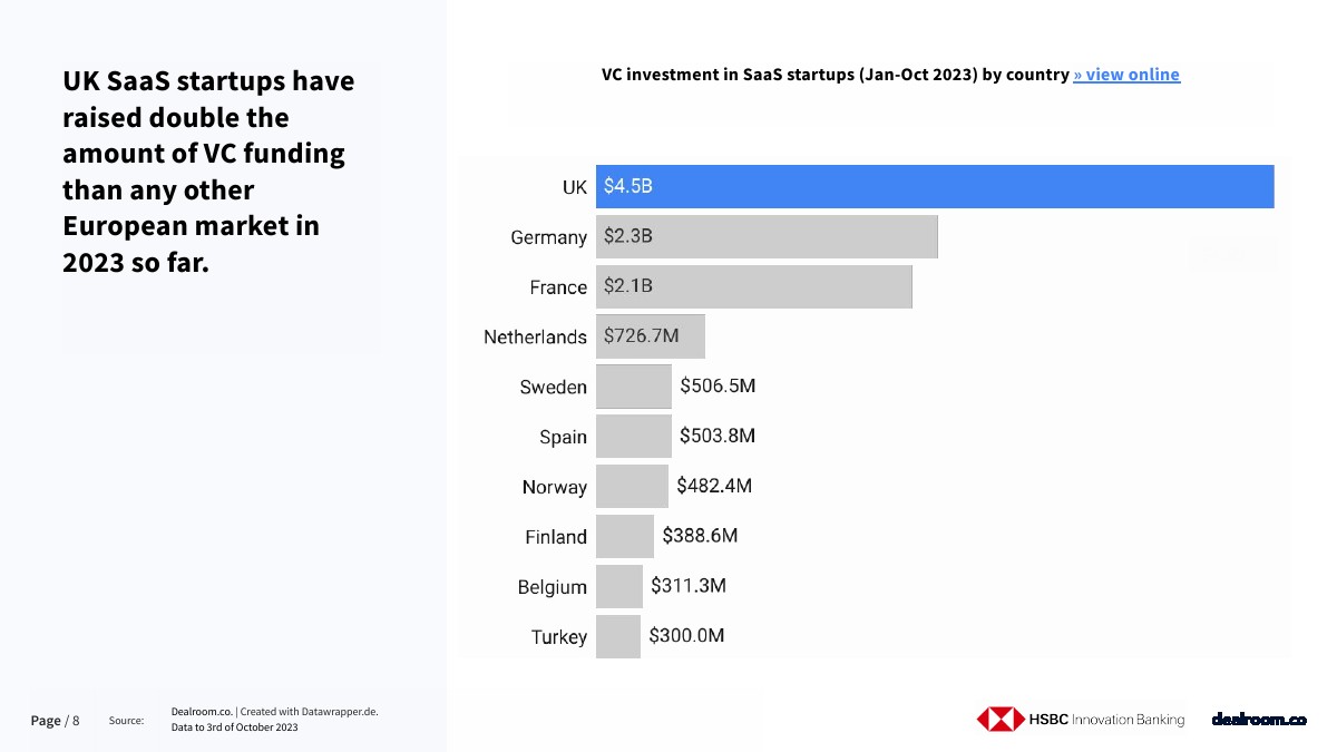 到目前为止,英国SaaS初创公司在2023年获得的风投资是其他欧洲市场的两倍。