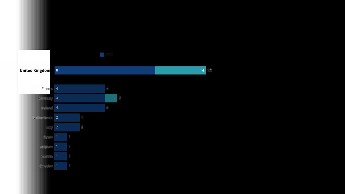 英国在2022年至2023年间产生了12家SaaS独角兽企业,超过了德国和法国的总和。