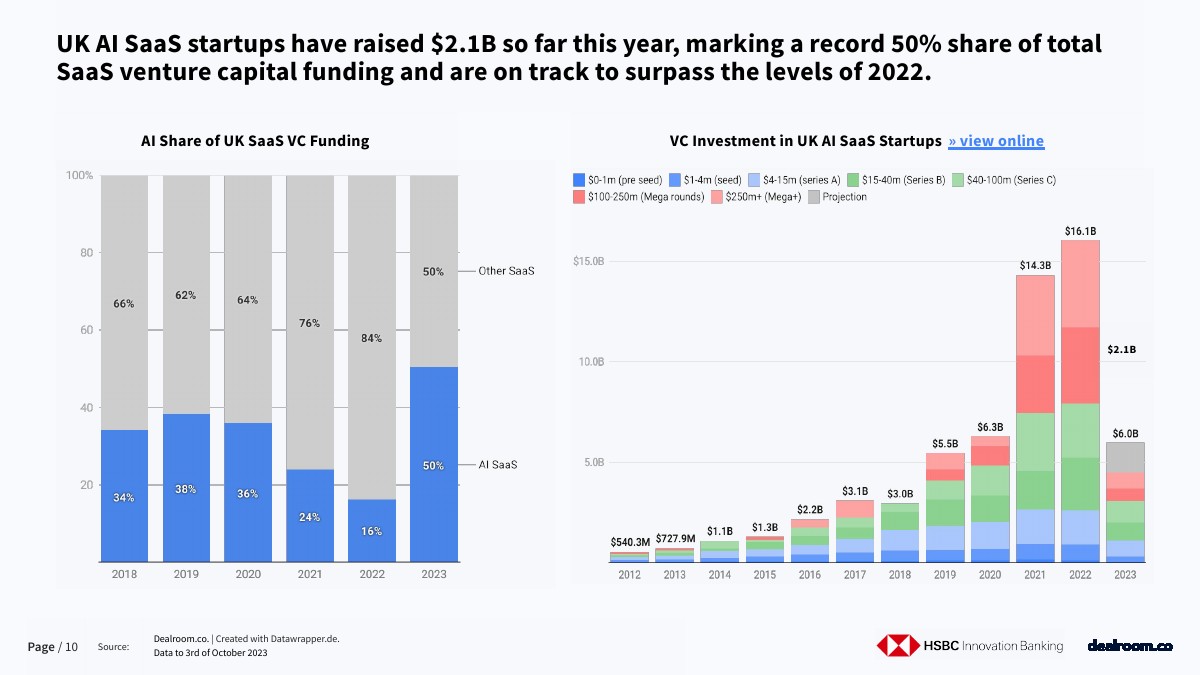 今年到目前为止,英国人工智能SaaS初创公司已经获得了21亿美元,在SaaS风险投资总额中所占的份额达到了创纪录的50%,并有望超过2022年的水平。
