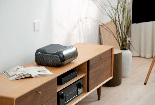 投出百吋画面时,坚果O2 Ultra 4K光机距离墙面距离加上光机左侧机身宽度不足45cm,恰好与绝大部分电视柜宽度(40-45cm)一致,而不需要额外定制电视柜。