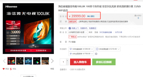 价格方面,激光电视往往对标的是电视机,一般价格偏贵,海信100L8K激光电视打出的口号是“全球首款 8K 激光电视”,售价高达39999元,即使是80英寸款,售价也突破万元,高达15999元。