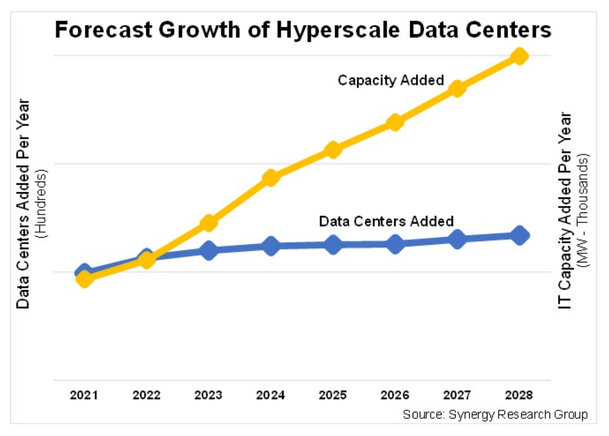 同时,随着单个数据中心的平均IT负载的提高,可操作的超大规模数据中心的数量将继续稳步增长。这还导致对现有数据中心进行一定程度的改造,以提高其容量。总体结果是,所有运营的超大规模数据中心的总容量将在未来六年内增长近三倍。