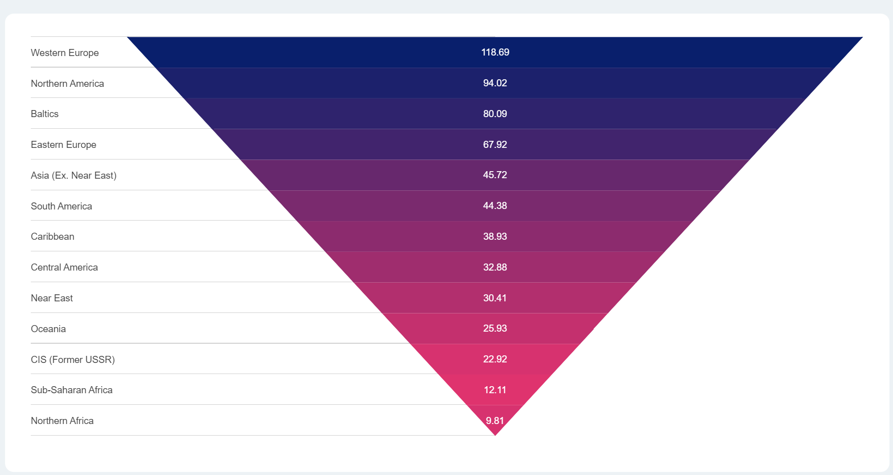 西欧所有28个国家都位于榜单的上半部分,其中8个国家位于前十。该地区的平均网速为118.69Mbps,是全球13个地区中最快的。