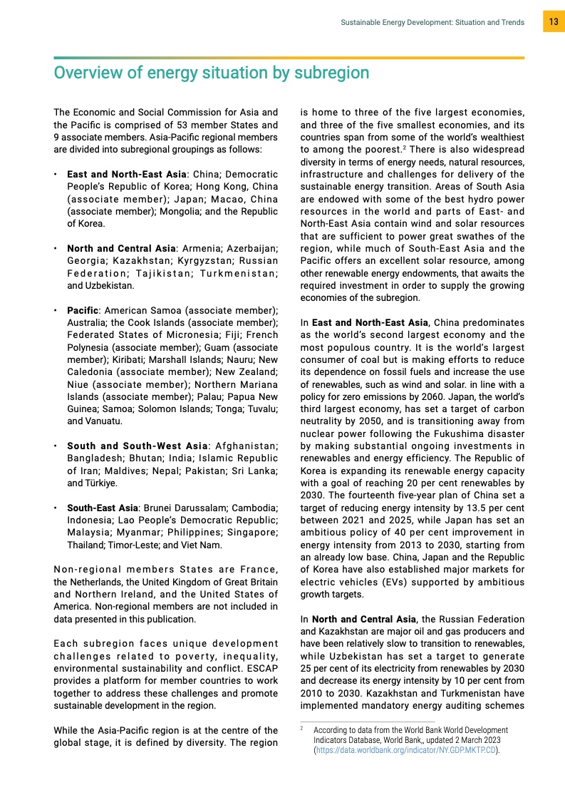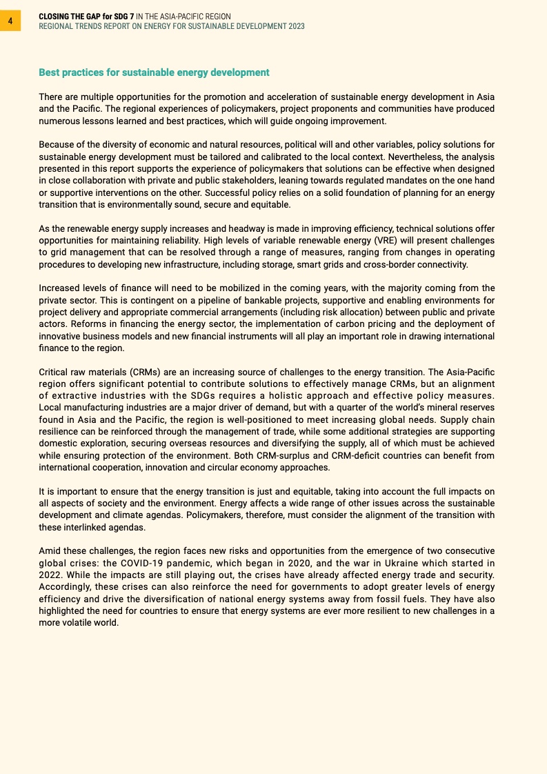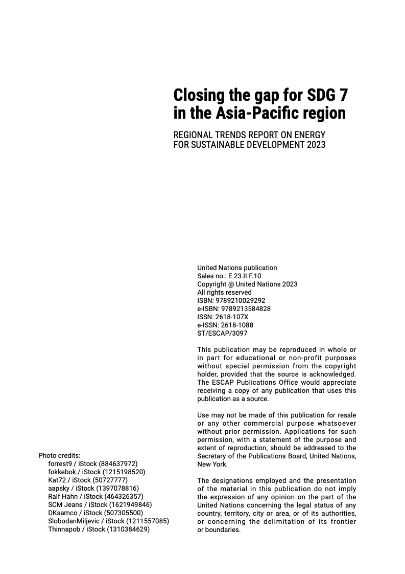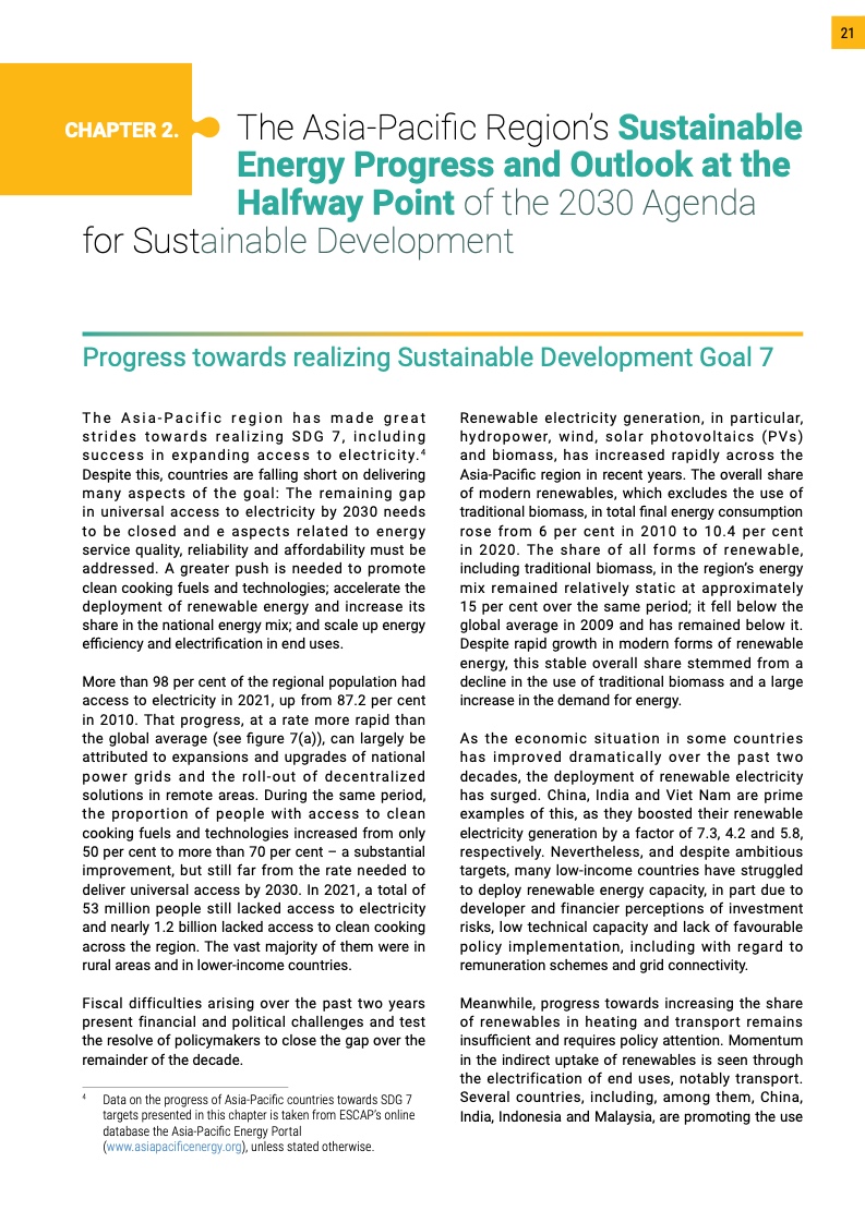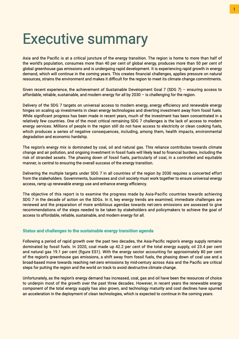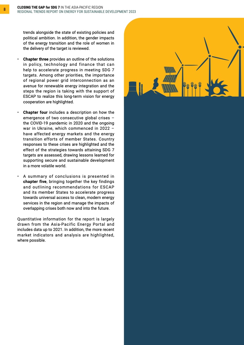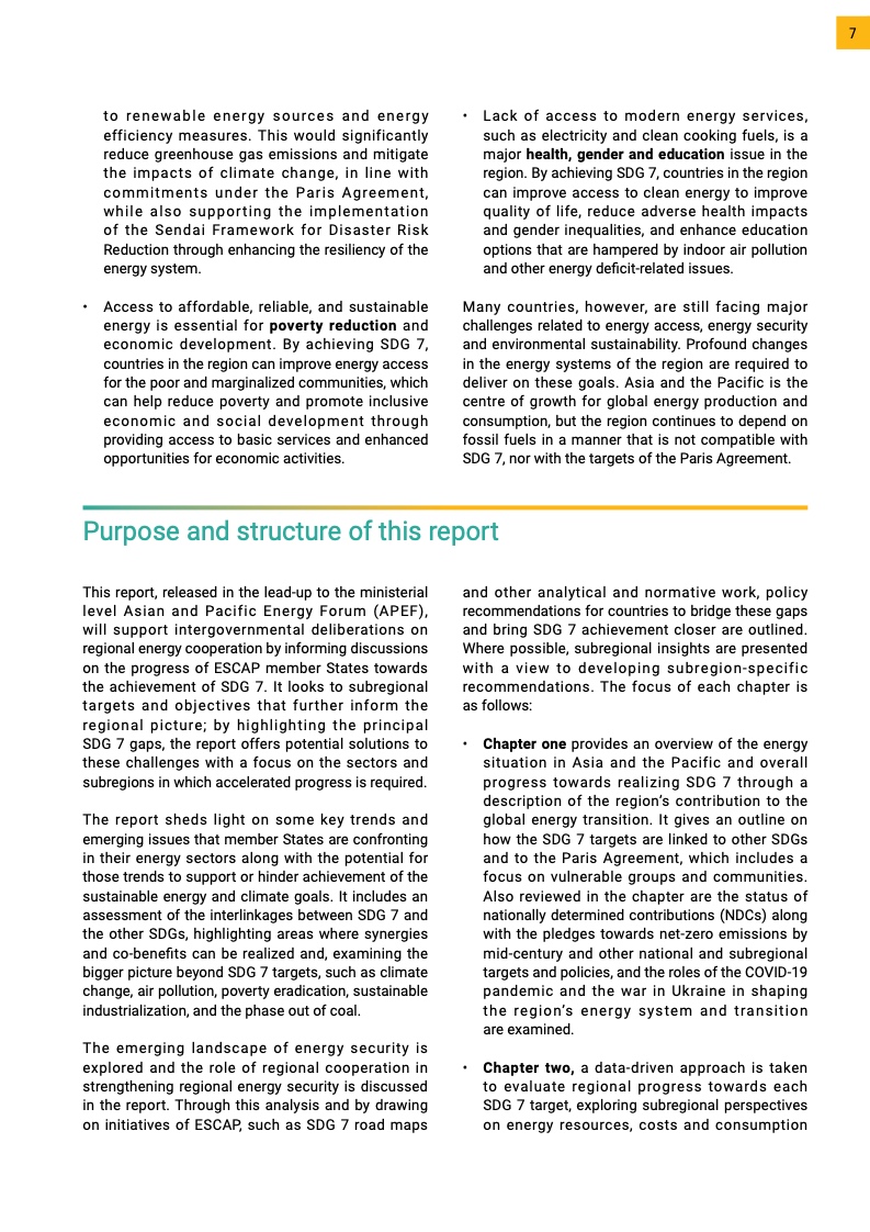 本报告旨在审查亚太国家在可持续发展目标行动十年中为实现可持续发展目标 7 所取得的进展。报告研究了主要的能源趋势,审查了当前面临的挑战,并评估了为实现净零排放而制定的更加雄心勃勃的议程,从而就利益相关方和政策制定者为实现人人享有负担得起的、可靠的、可持续的现代能源这一目标而需要采取的措施提出建议。