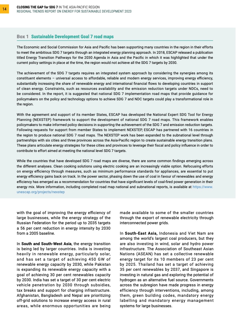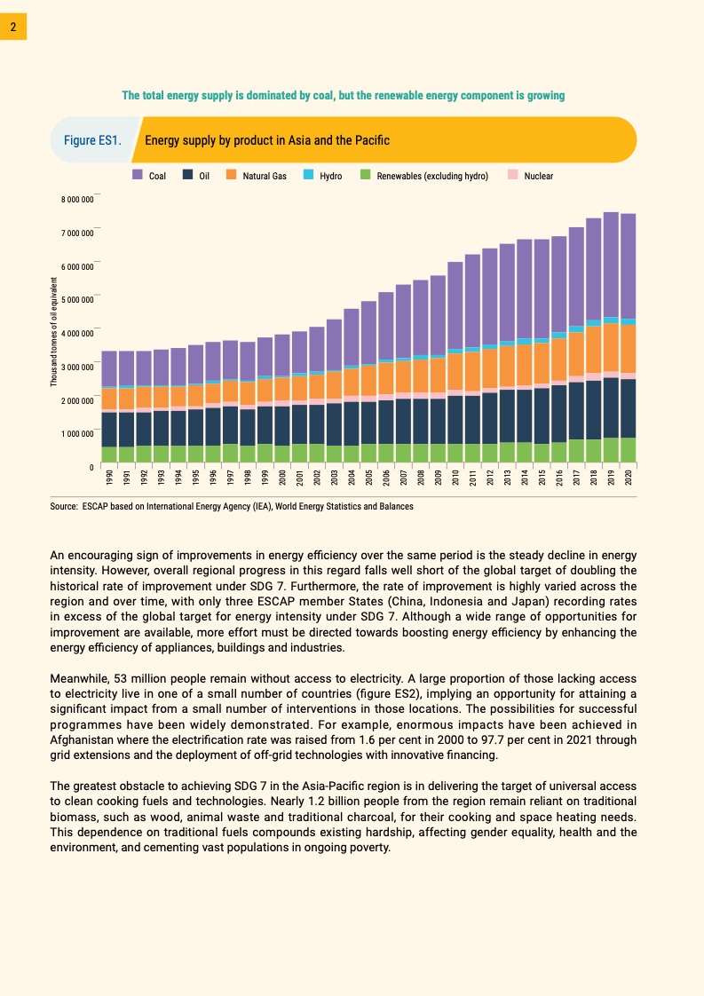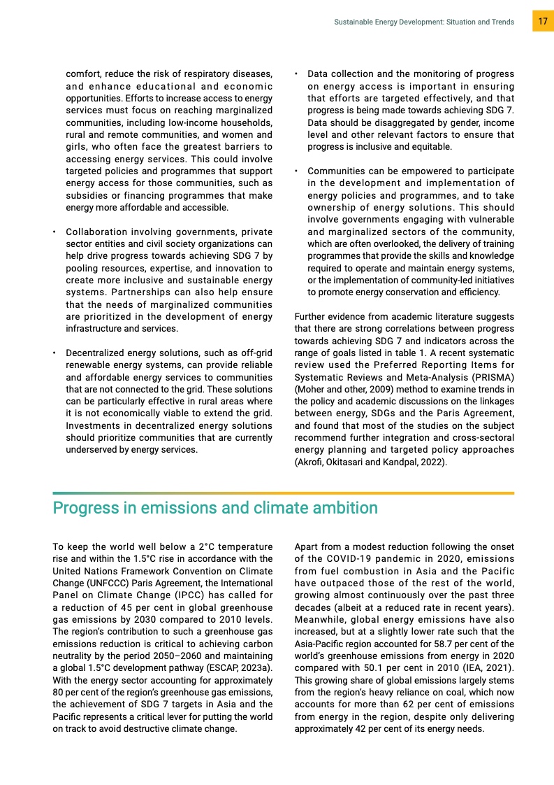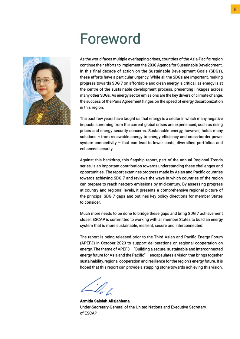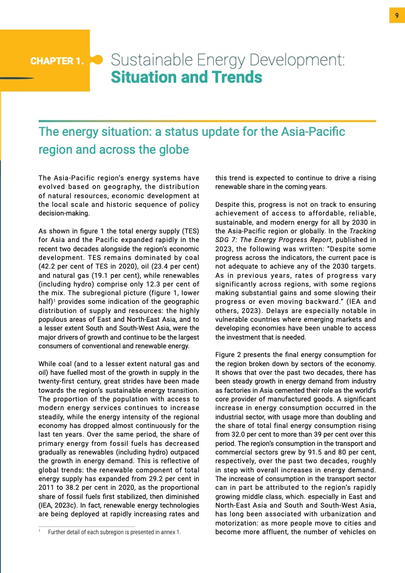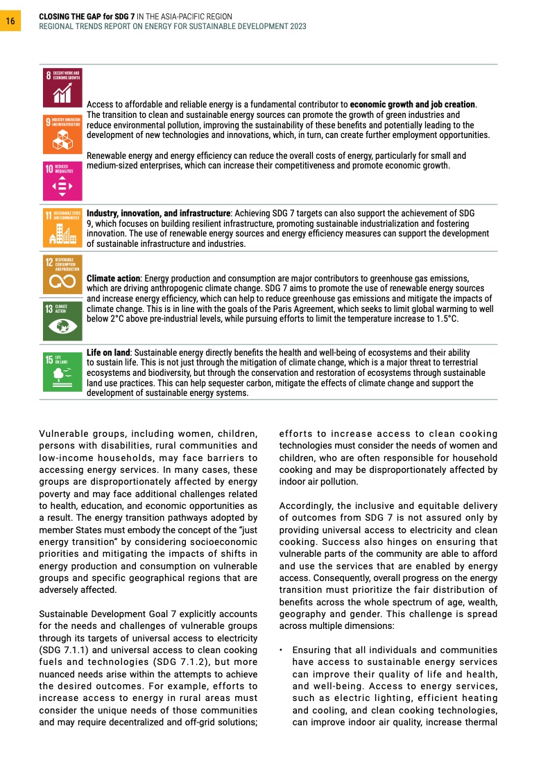 本报告旨在审查亚太国家在可持续发展目标行动十年中为实现可持续发展目标 7 所取得的进展。报告研究了主要的能源趋势,审查了当前面临的挑战,并评估了为实现净零排放而制定的更加雄心勃勃的议程,从而就利益相关方和政策制定者为实现人人享有负担得起的、可靠的、可持续的现代能源这一目标而需要采取的措施提出建议。