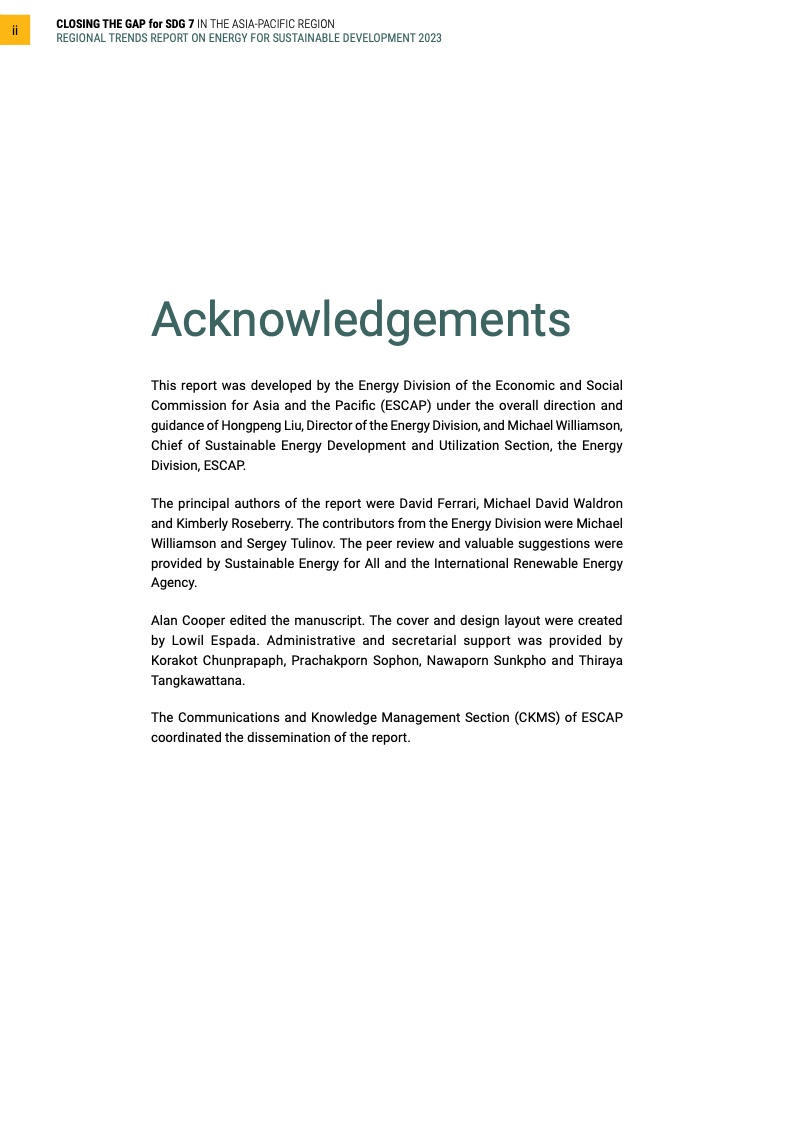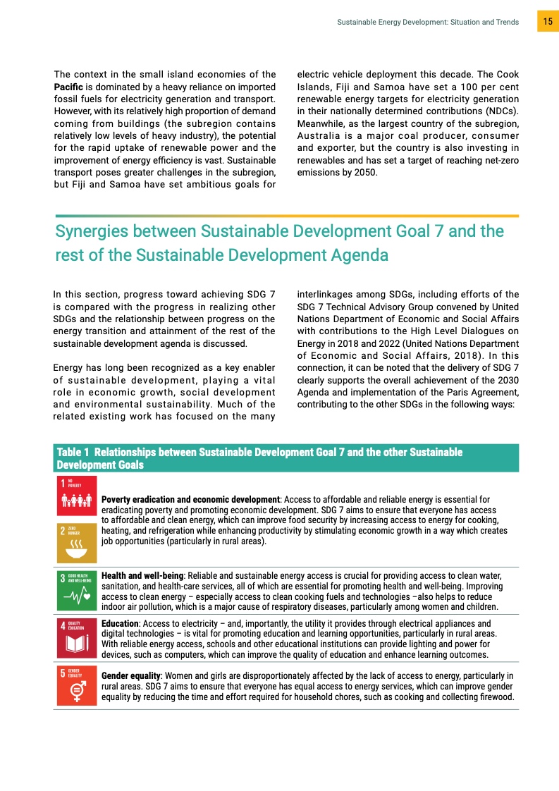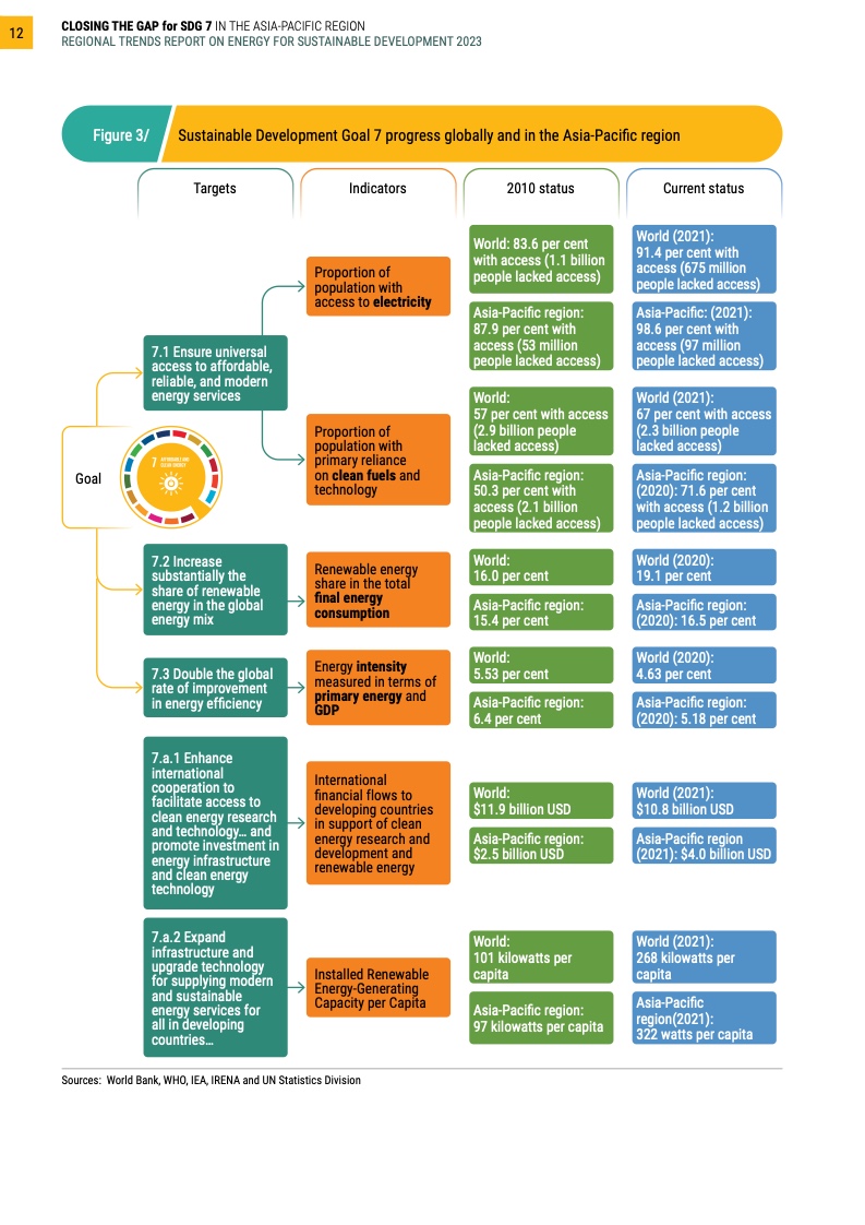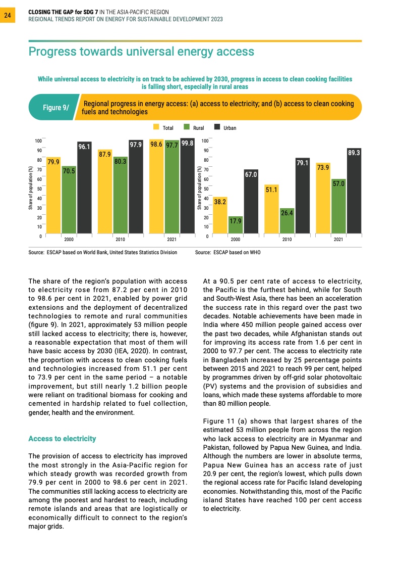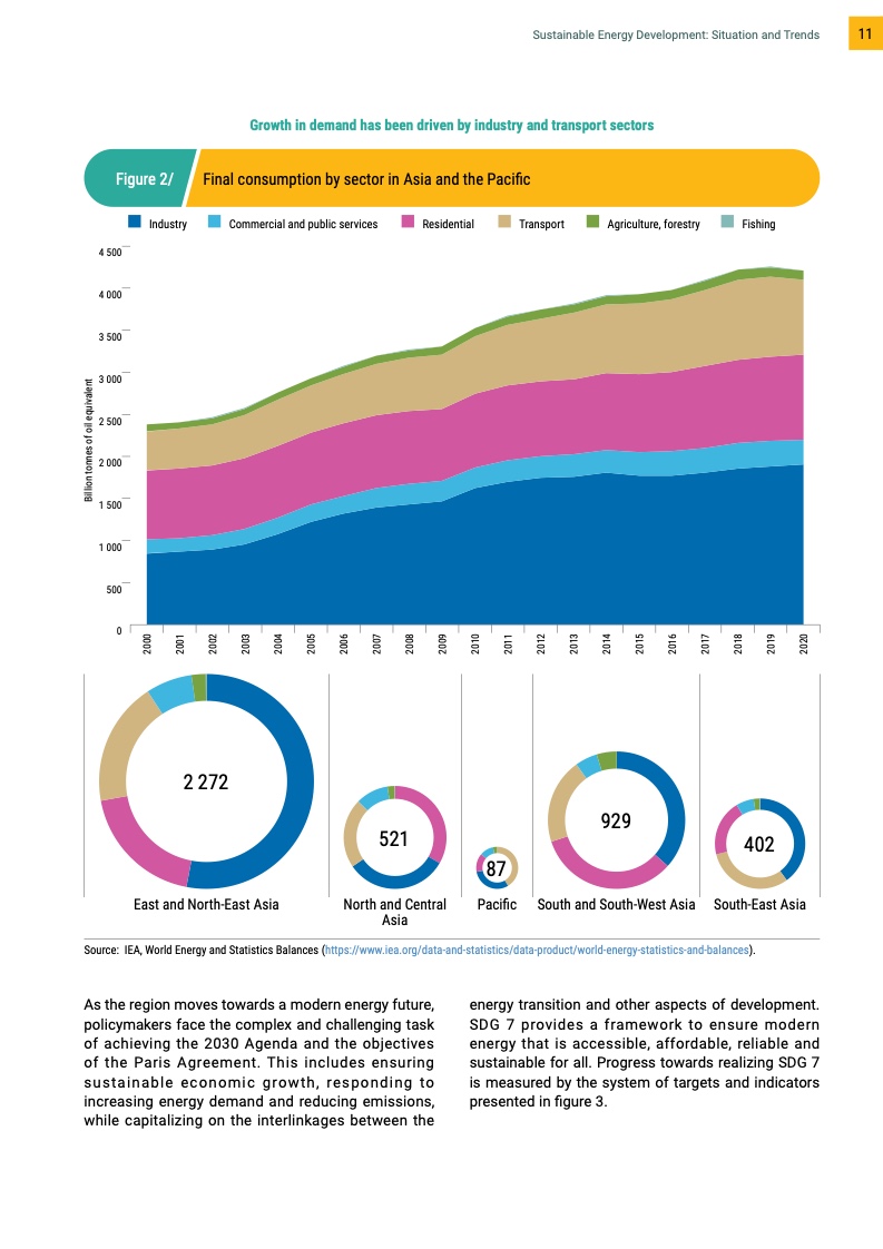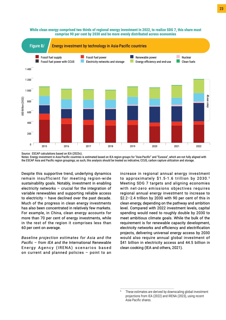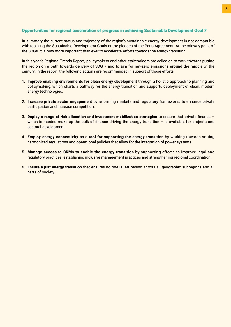 本报告旨在审查亚太国家在可持续发展目标行动十年中为实现可持续发展目标 7 所取得的进展。报告研究了主要的能源趋势,审查了当前面临的挑战,并评估了为实现净零排放而制定的更加雄心勃勃的议程,从而就利益相关方和政策制定者为实现人人享有负担得起的、可靠的、可持续的现代能源这一目标而需要采取的措施提出建议。