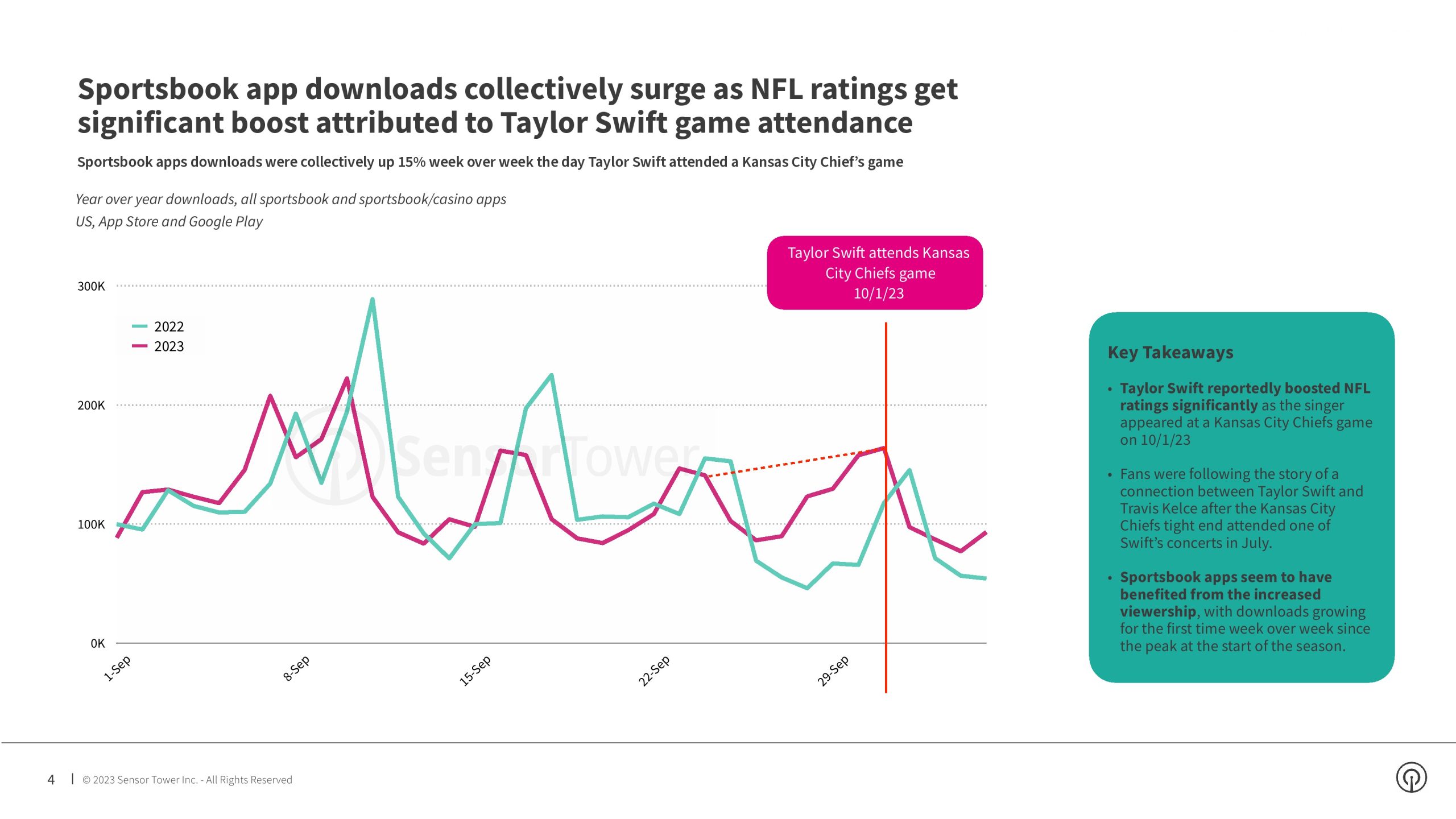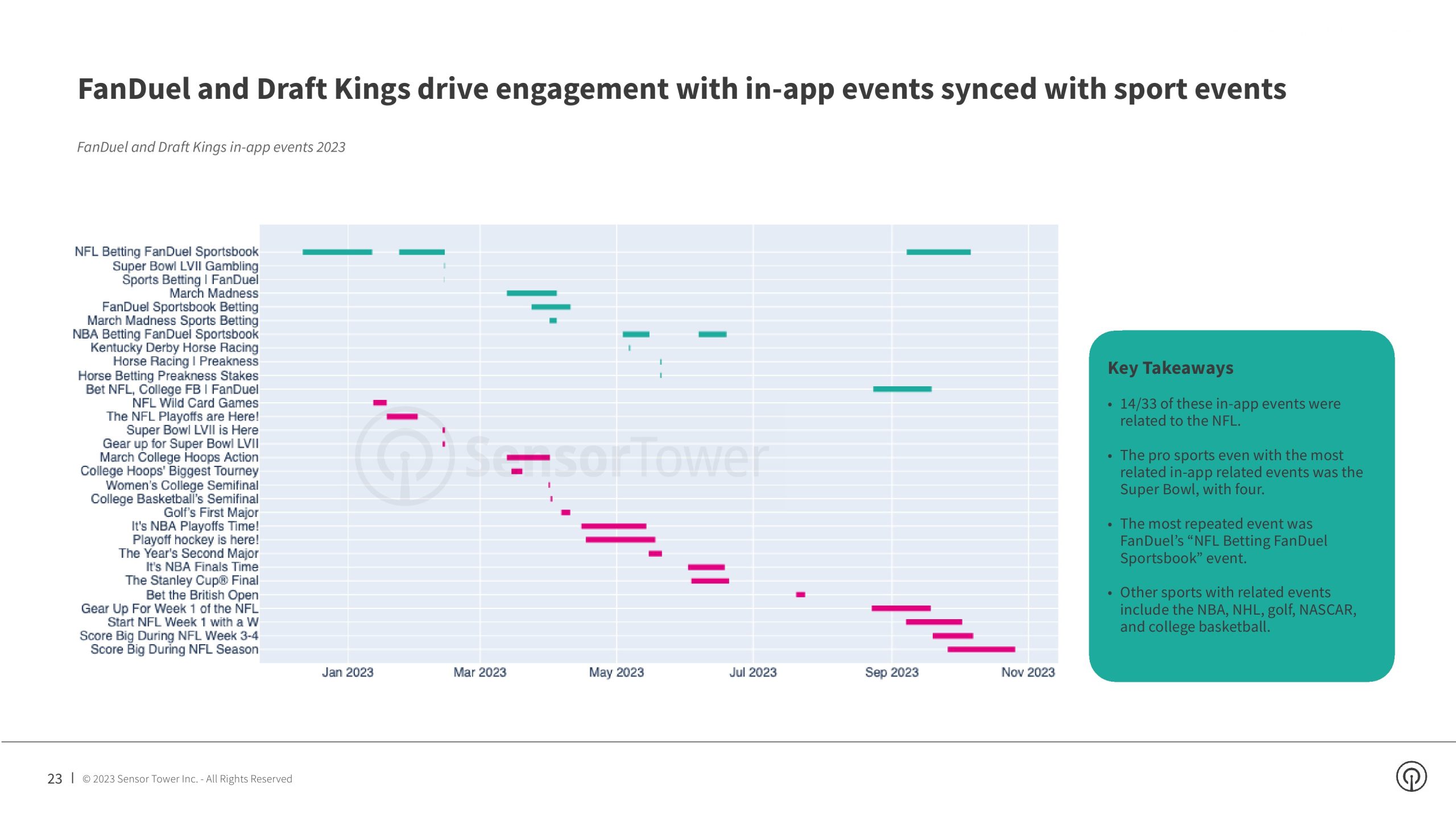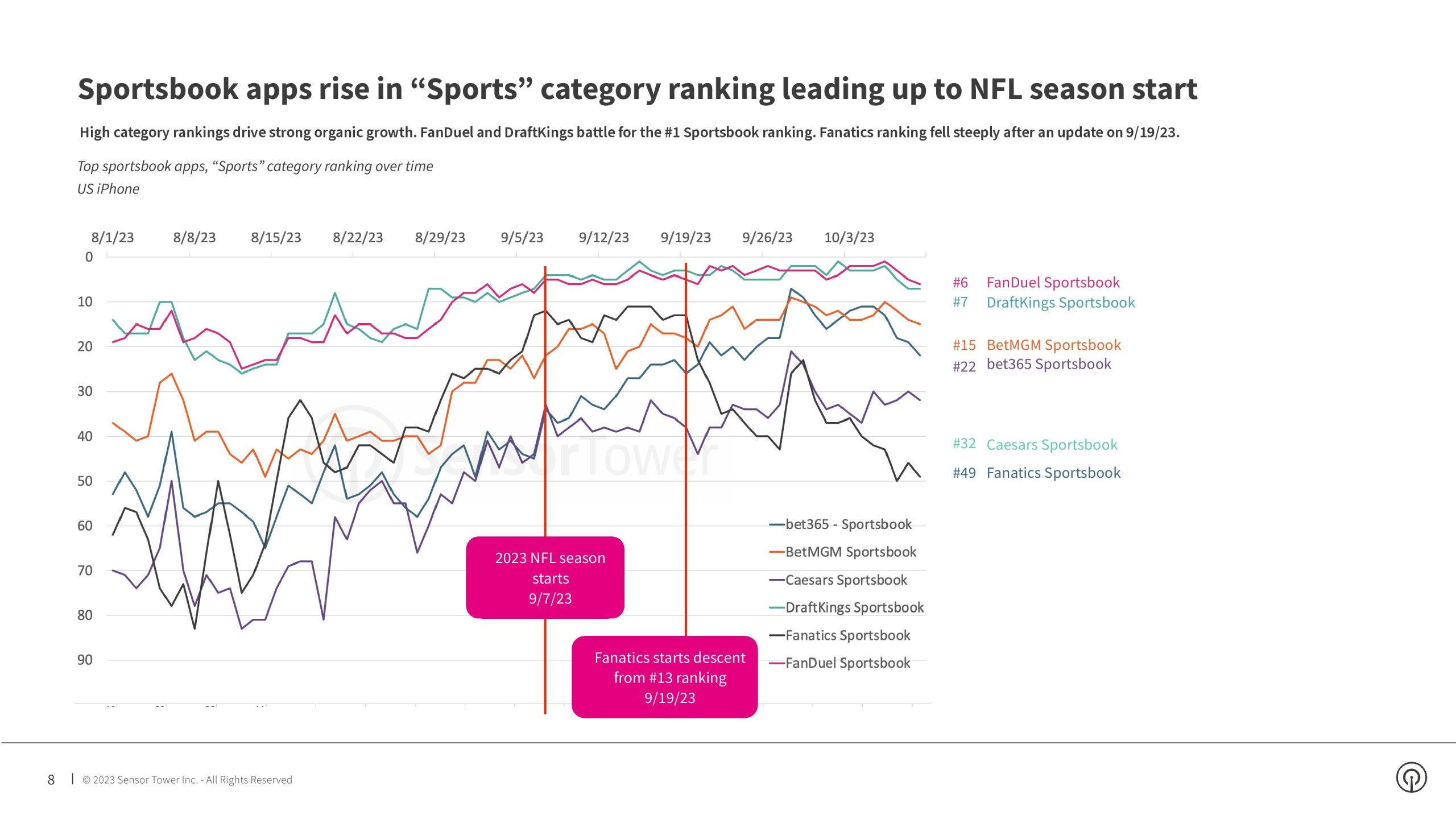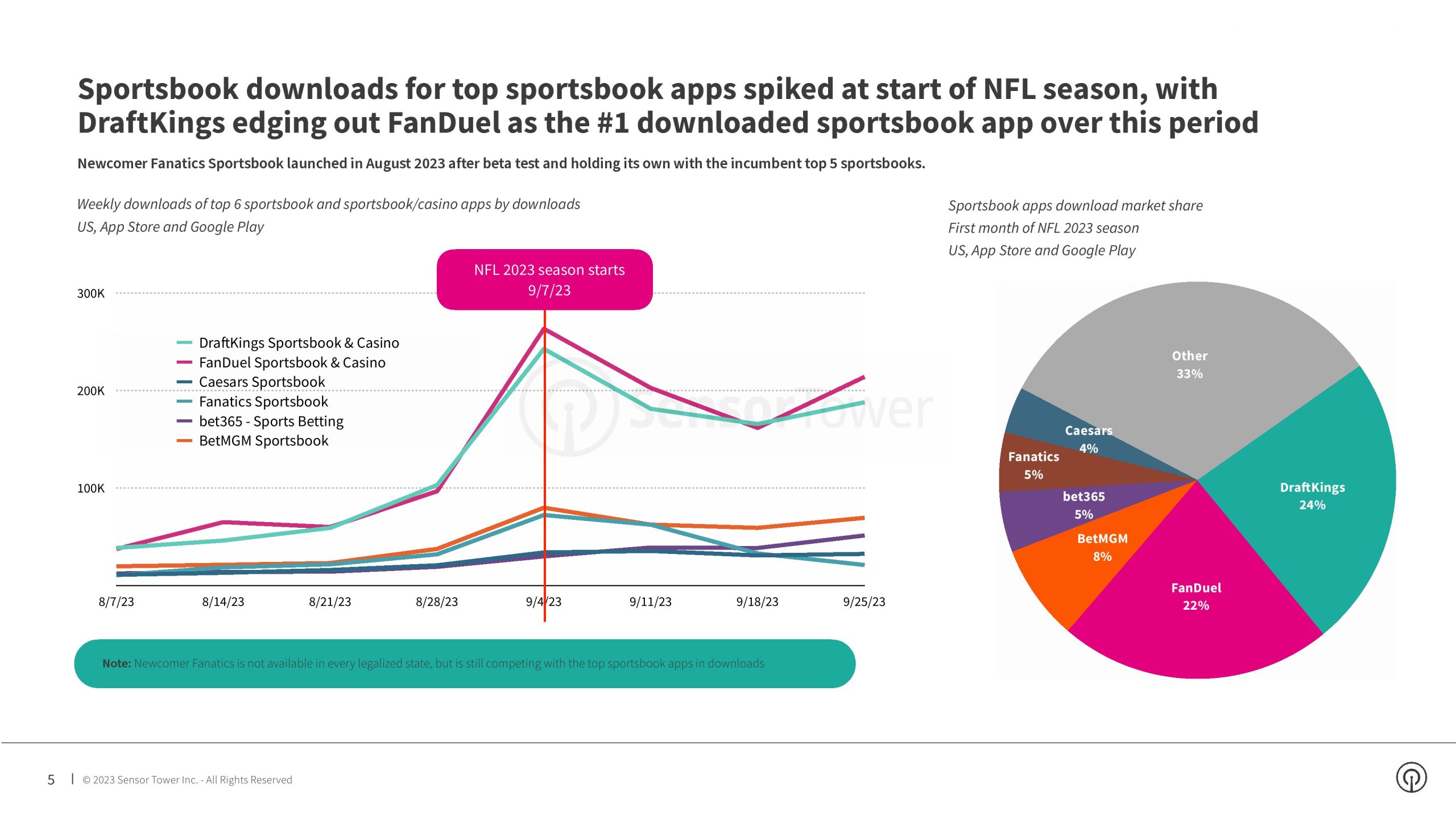 SensorTower在报告中分析了2023年NFL开赛如何推动体育博彩应用的表现,以及DraftKings和FanDuel等体育博彩与去年相比的竞争情况。