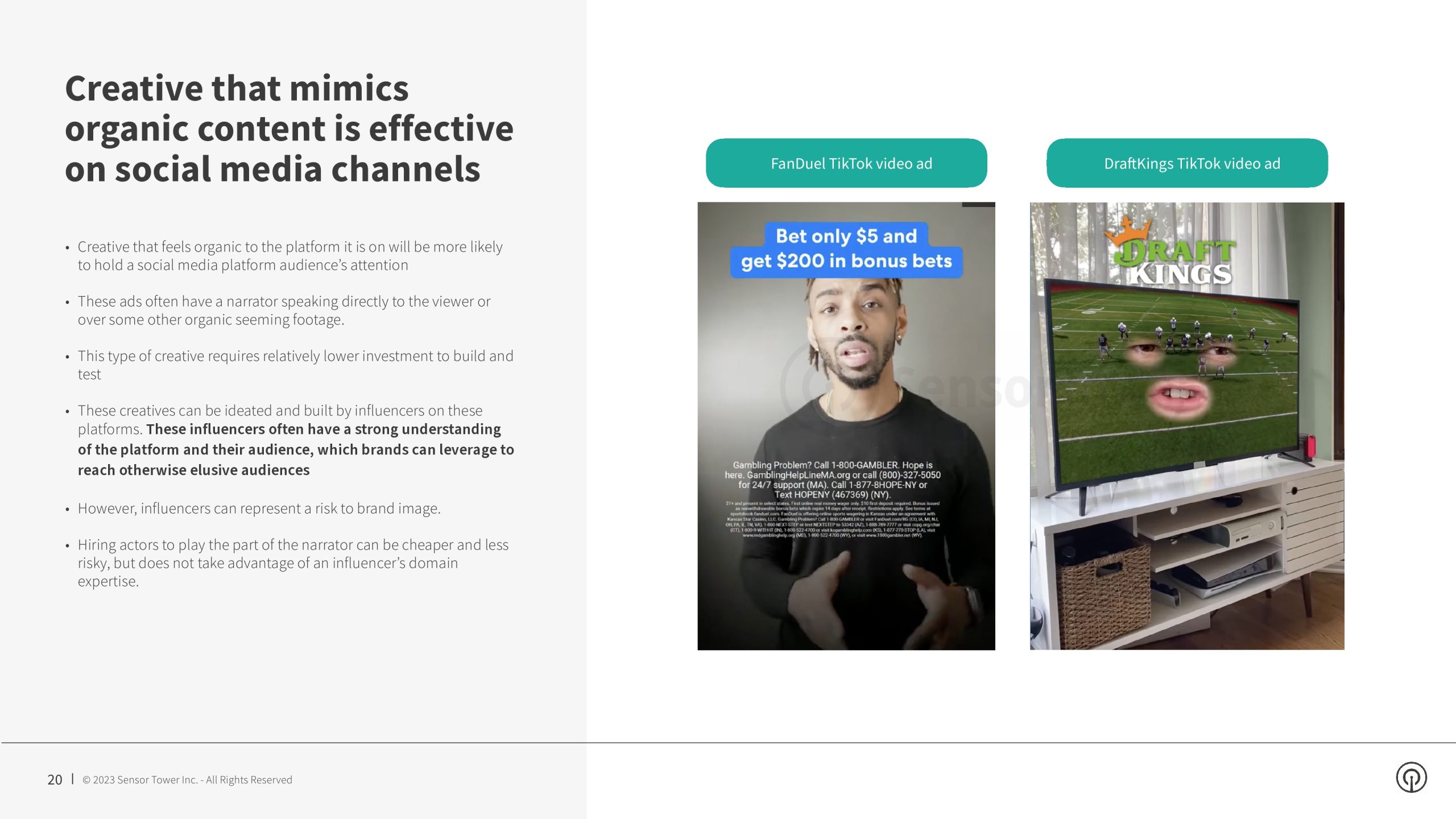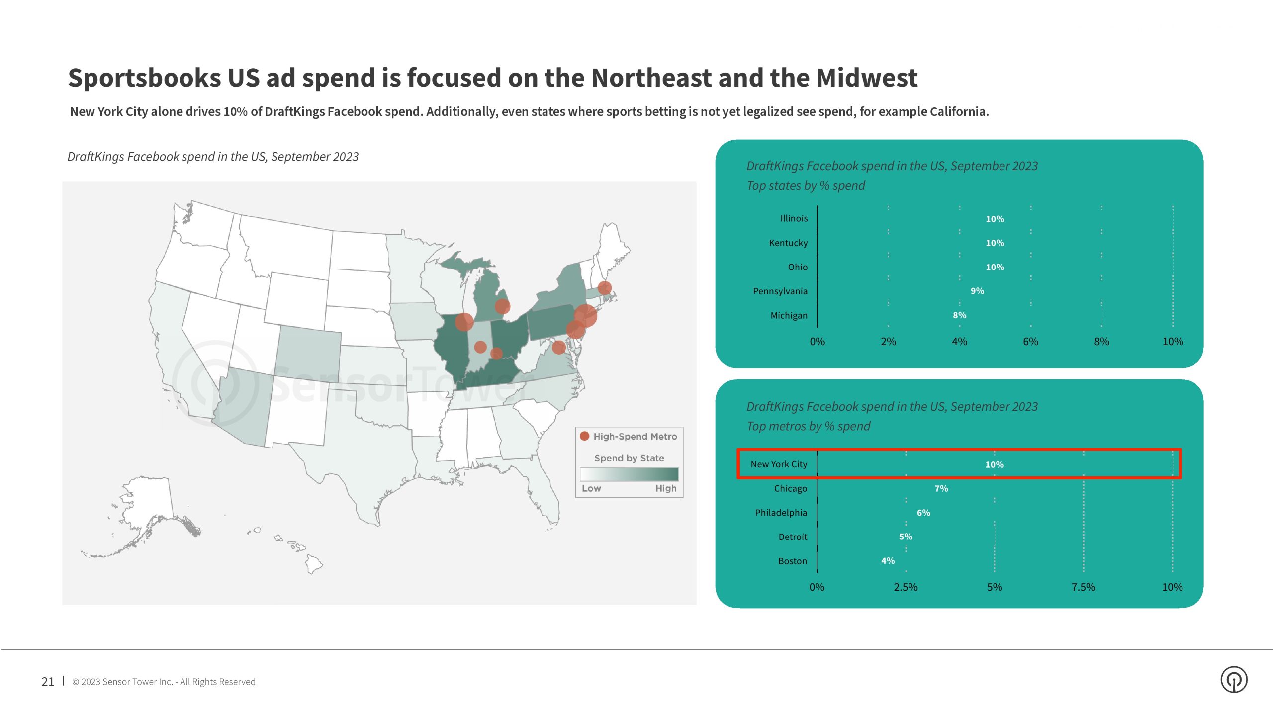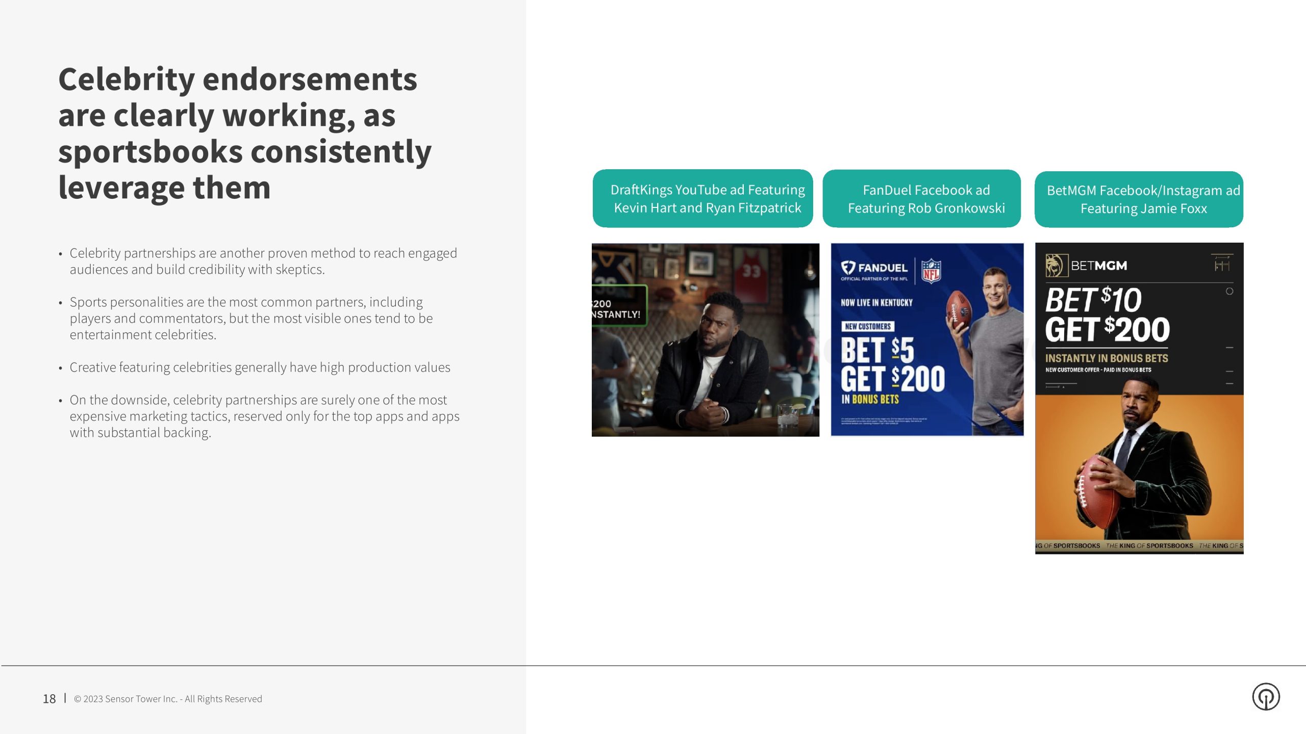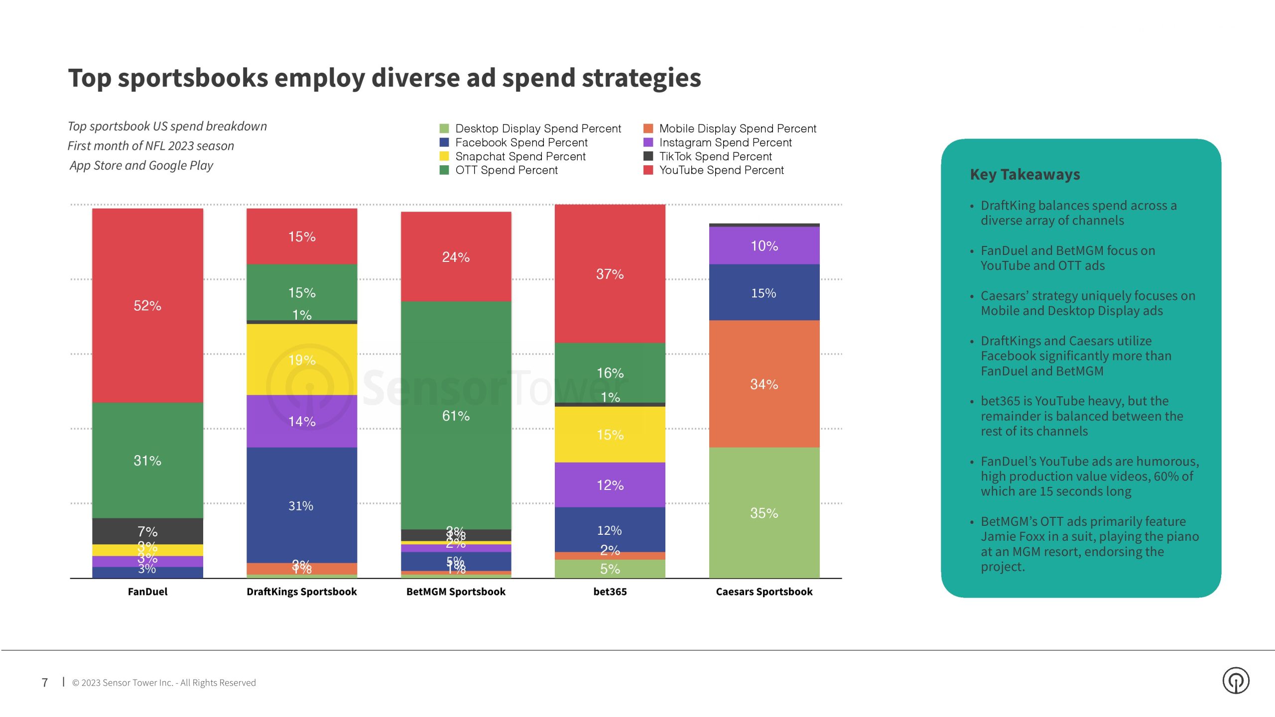 广告支出多样性:探索顶级体育博彩的多样化广告支出策略,从DraftKings的平衡多样性到FanDuel和BetMGM对高质量视频创意的关注。名人代言和受意见领袖启发的广告也在改变着游戏。