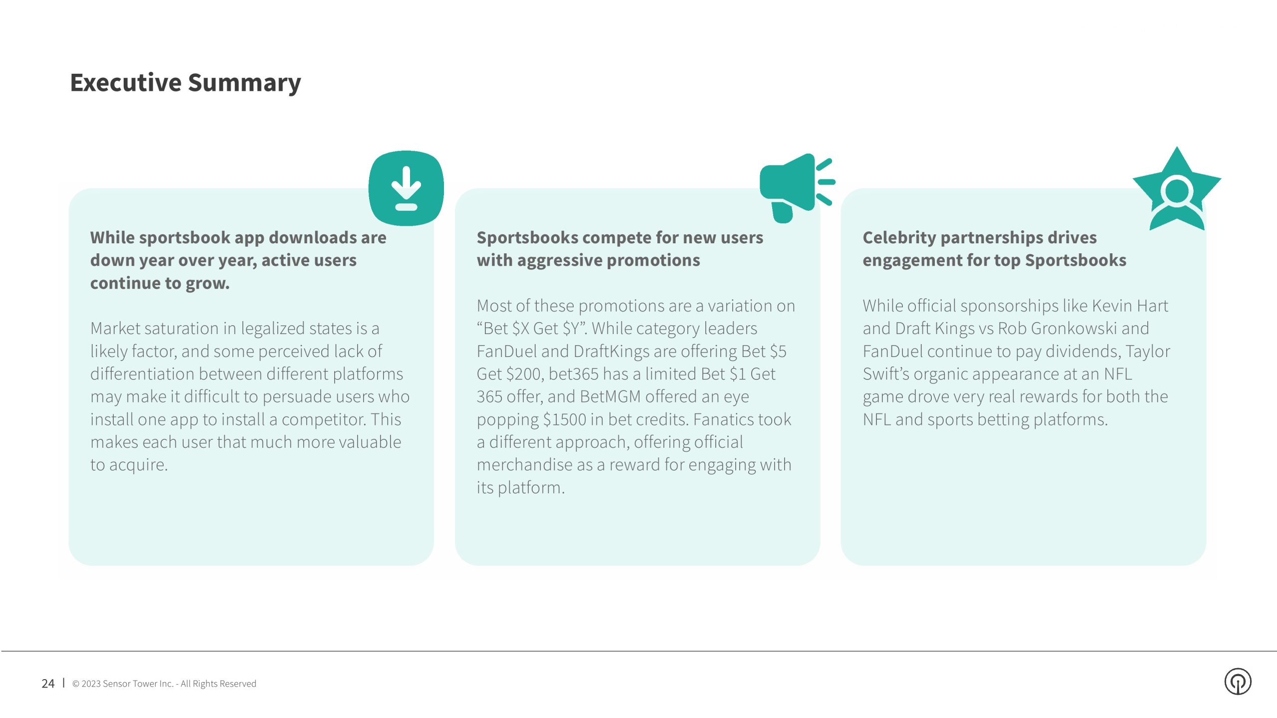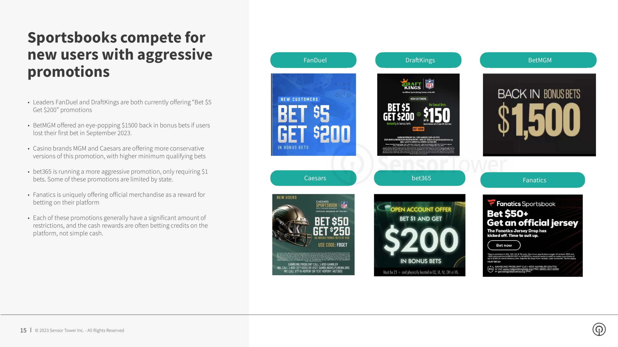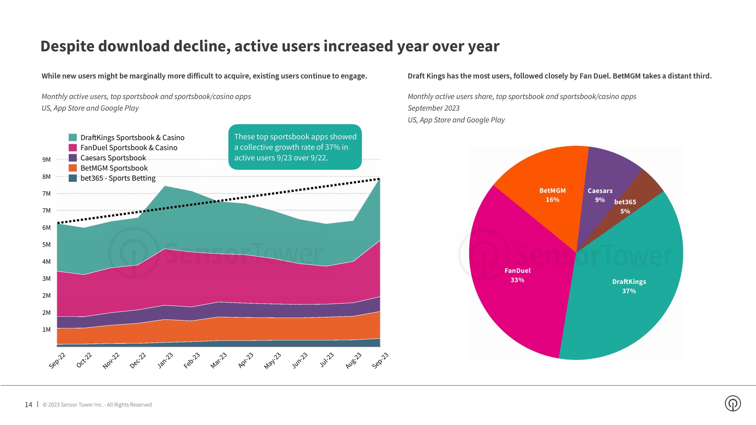 随着体育博彩生态系统的竞争格局不断演变,Fanatics和ESPN BET等新玩家的加入,FanDuel和DraftKings等体育博彩应用之间的动态也在不断变化。在2022年至2023年的NFL赛季期间,市场饱和度、用户参与度、促销策略和立法进展等因素相互作用。各州继续合法化,从2022年的纽约到上个月的肯塔基州,体育博彩竞争激烈。