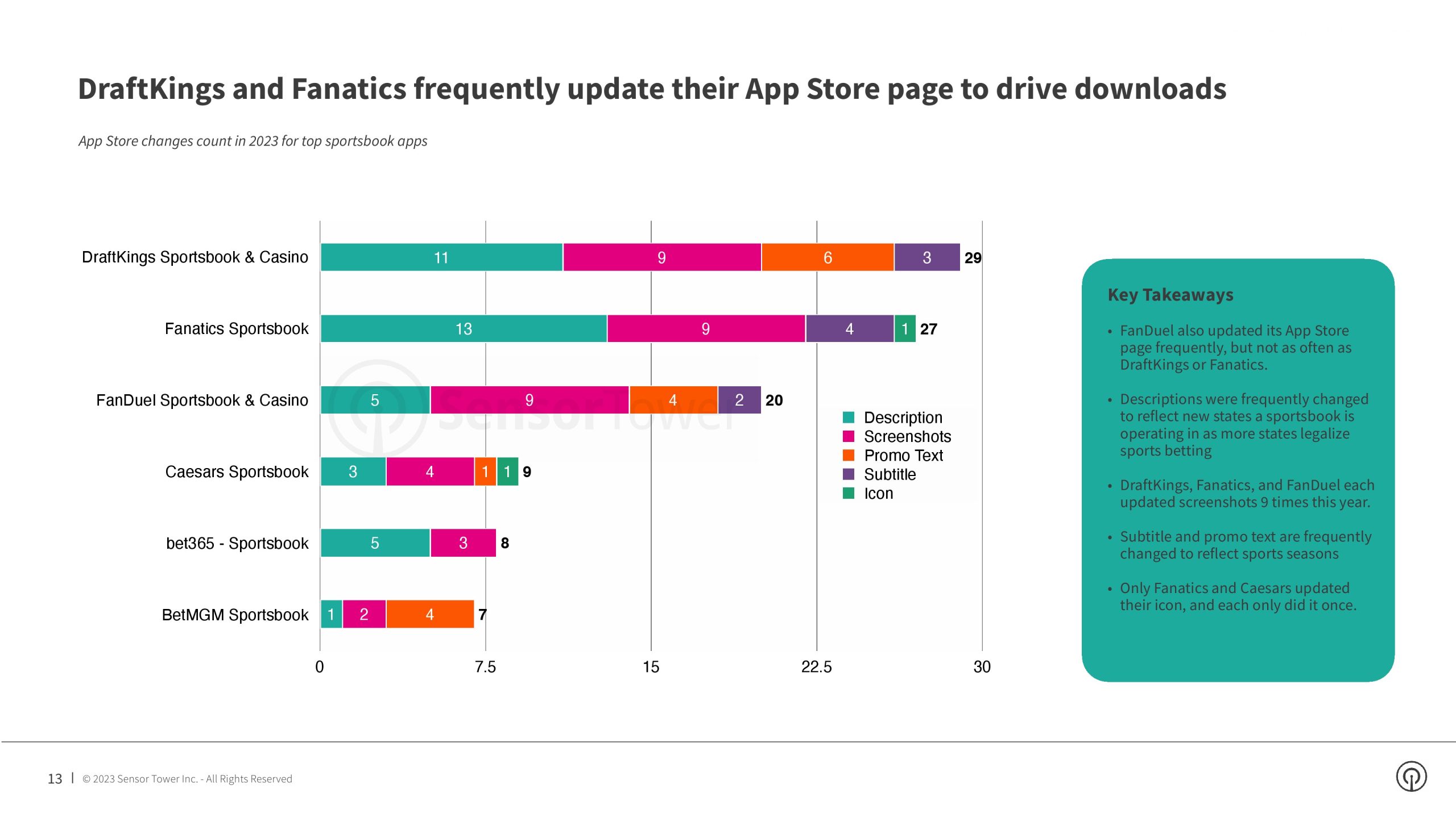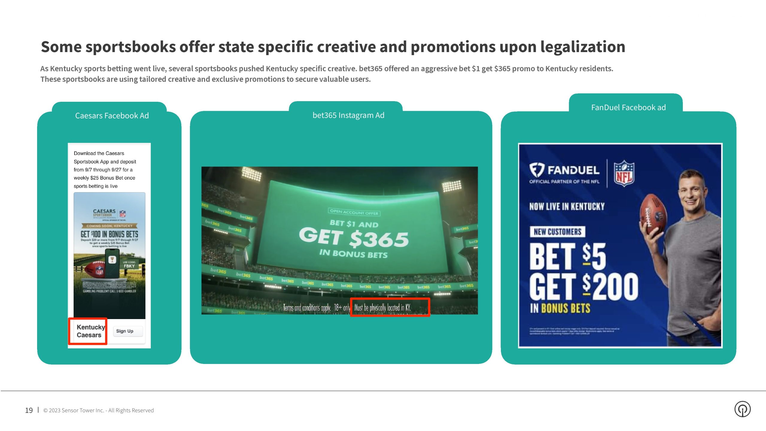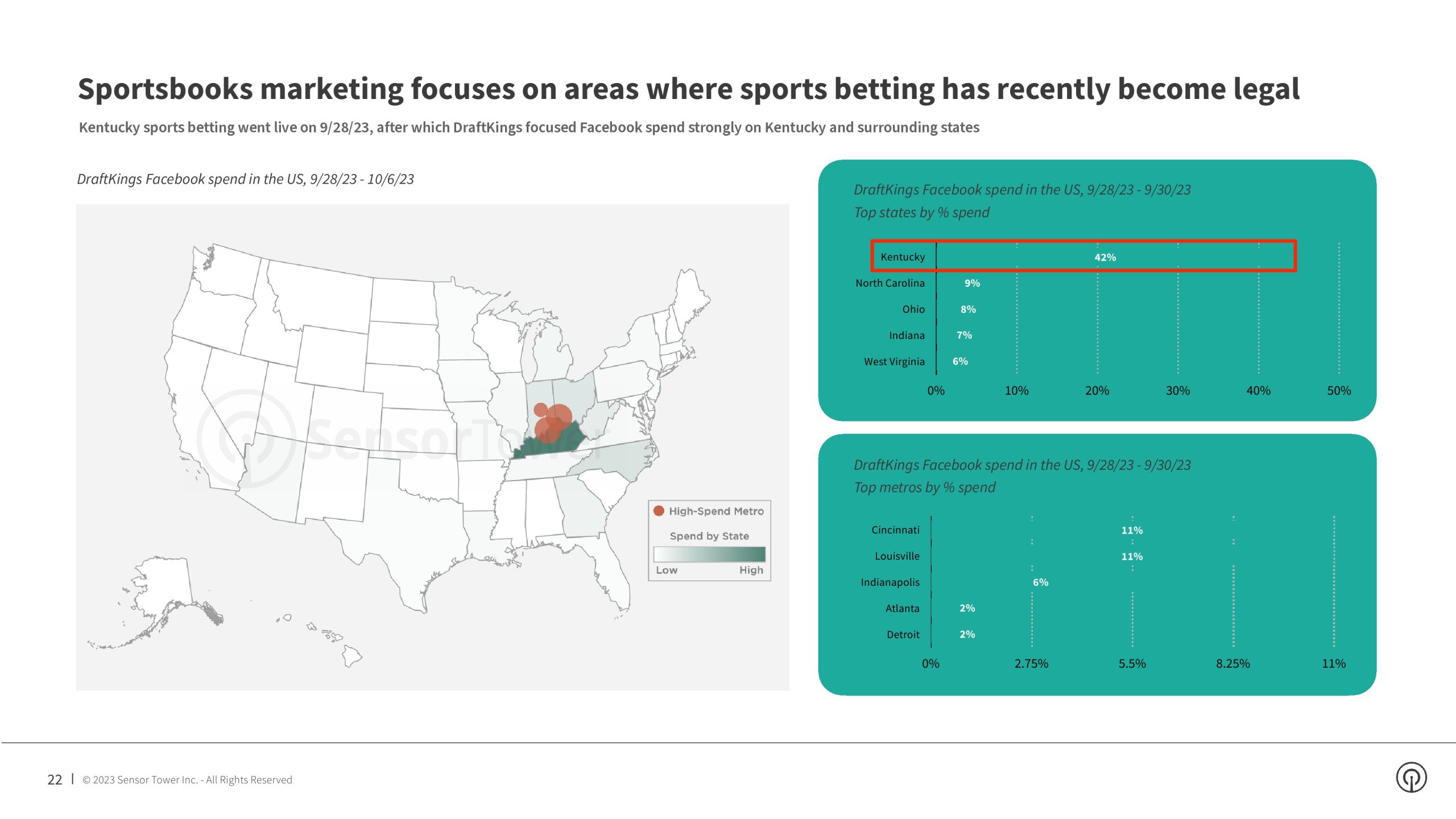 随着体育博彩生态系统的竞争格局不断演变,Fanatics和ESPN BET等新玩家的加入,FanDuel和DraftKings等体育博彩应用之间的动态也在不断变化。在2022年至2023年的NFL赛季期间,市场饱和度、用户参与度、促销策略和立法进展等因素相互作用。各州继续合法化,从2022年的纽约到上个月的肯塔基州,体育博彩竞争激烈。