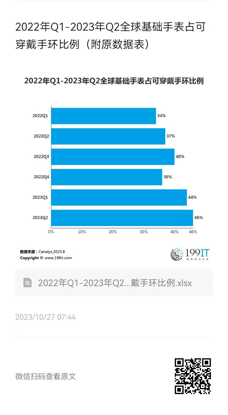 2022年Q1-2023年Q2全球基础手表占可穿戴手环比例(附原数据表) ​​​