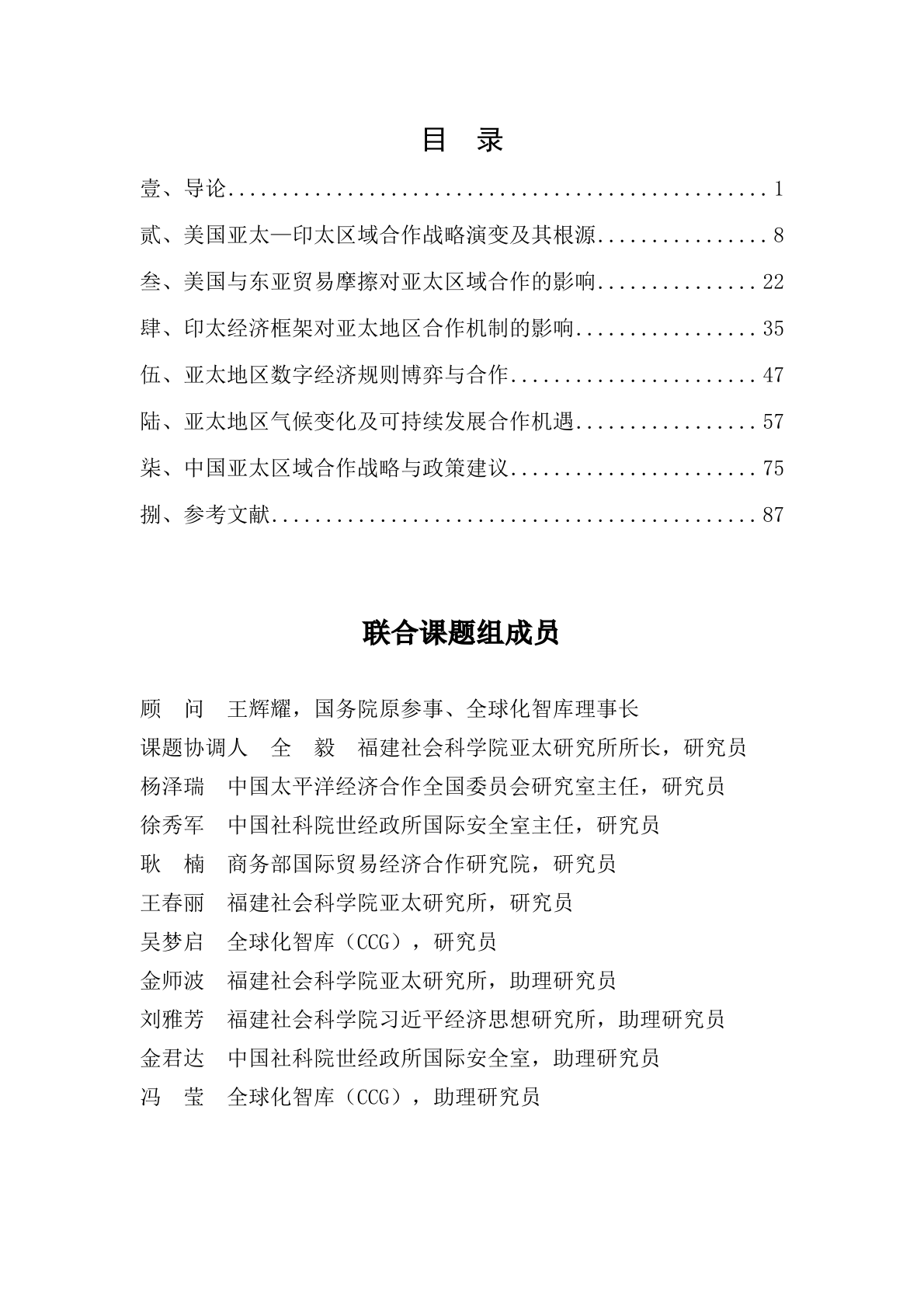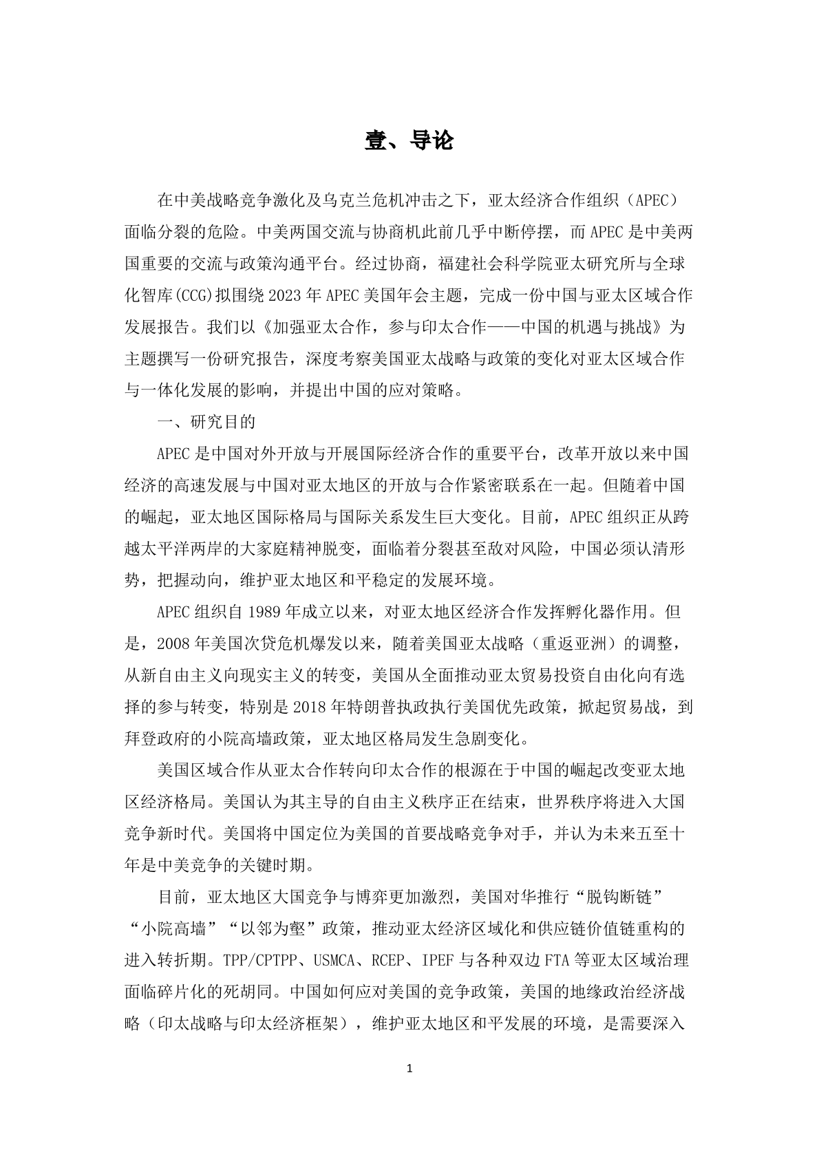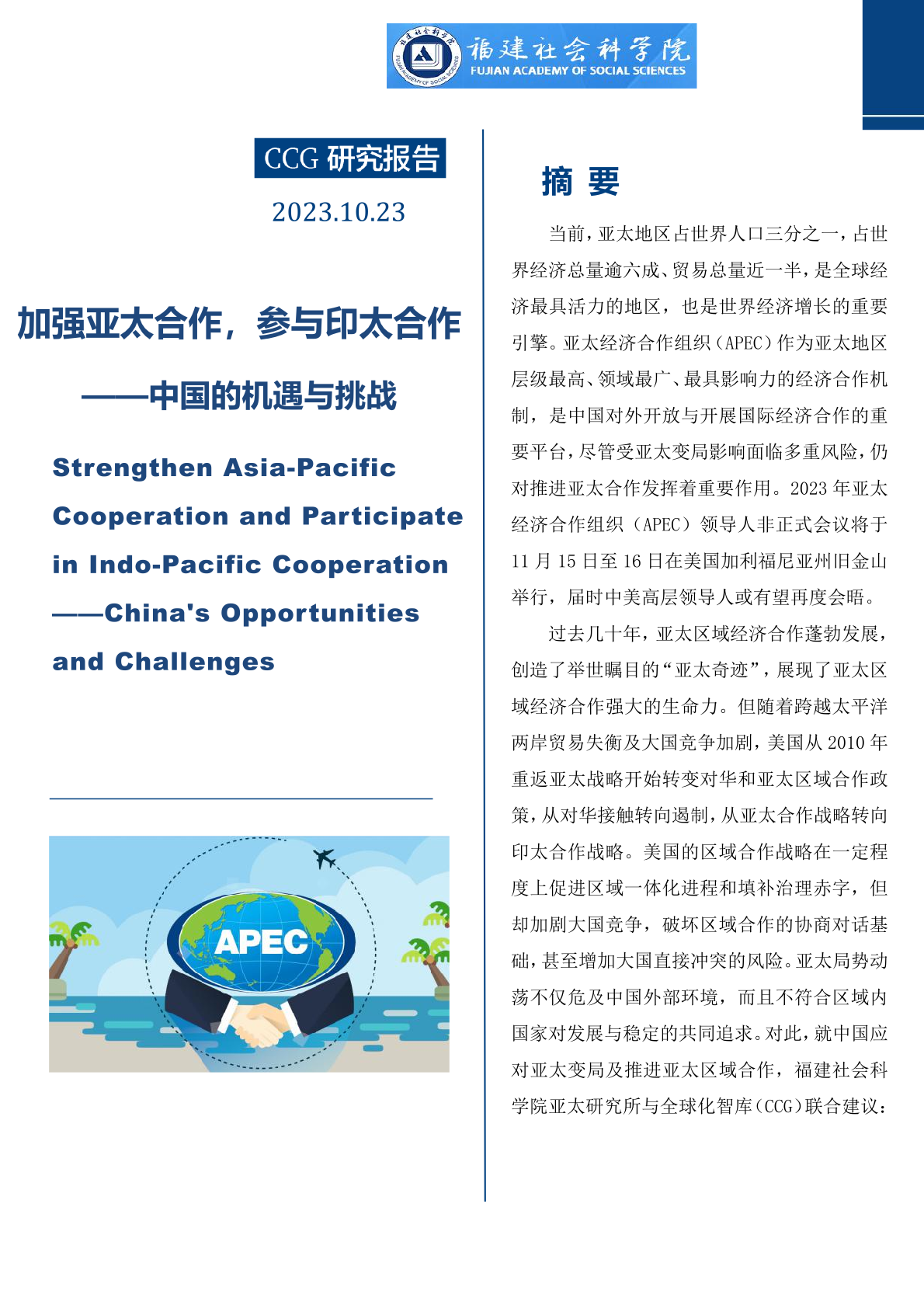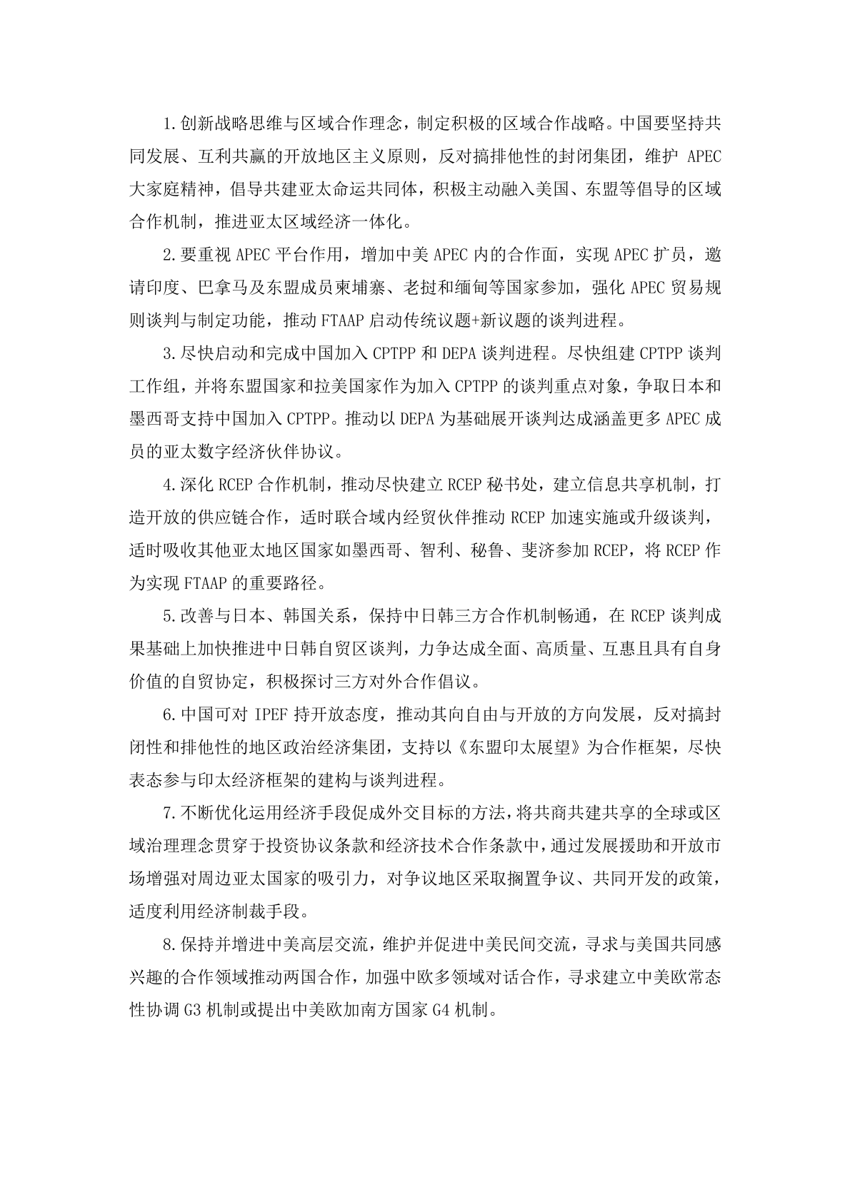 过去几十年,亚太区域经济合作蓬勃发展, 创造了举世瞩目的“亚太奇迹”,展现了亚太区 域经济合作强大的生命力。但随着跨越太平洋 两岸贸易失衡及大国竞争加剧,美国从 2010 年 重返亚太战略开始转变对华和亚太区域合作政 策,从对华接触转向遏制,从亚太合作战略转向 印太合作战略。美国的区域合作战略在一定程 度上促进区域一体化进程和填补治理赤字,但 却加剧大国竞争,破坏区域合作的协商对话基 础,甚至增加大国直接冲突的风险。亚太局势动 荡不仅危及中国外部环境,而且不符合区域内 国家对发展与稳定的共同追求。对此,就中国应 对亚太变局及推进亚太区域合作,福建社会科 学院亚太研究所与全球化智库(CCG)联合建议: