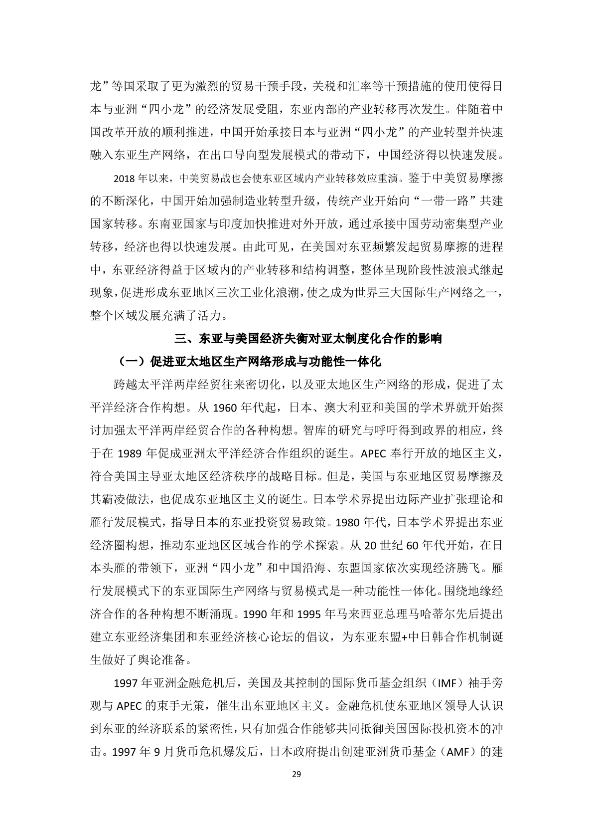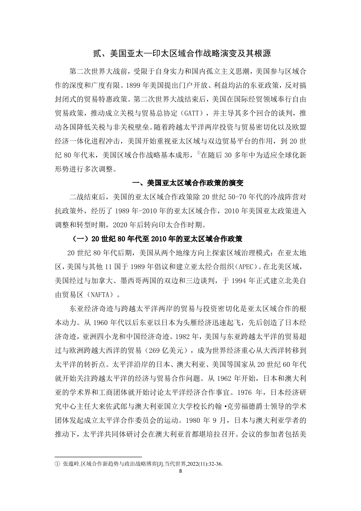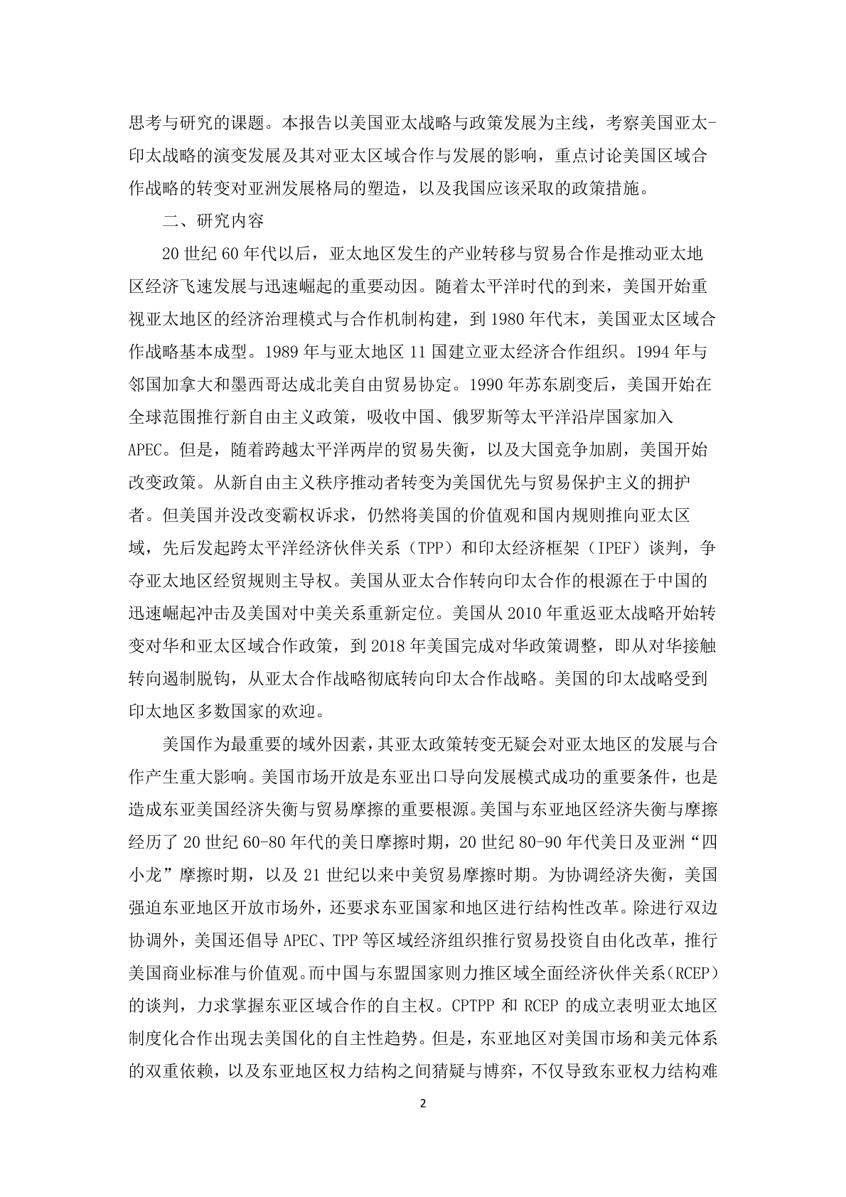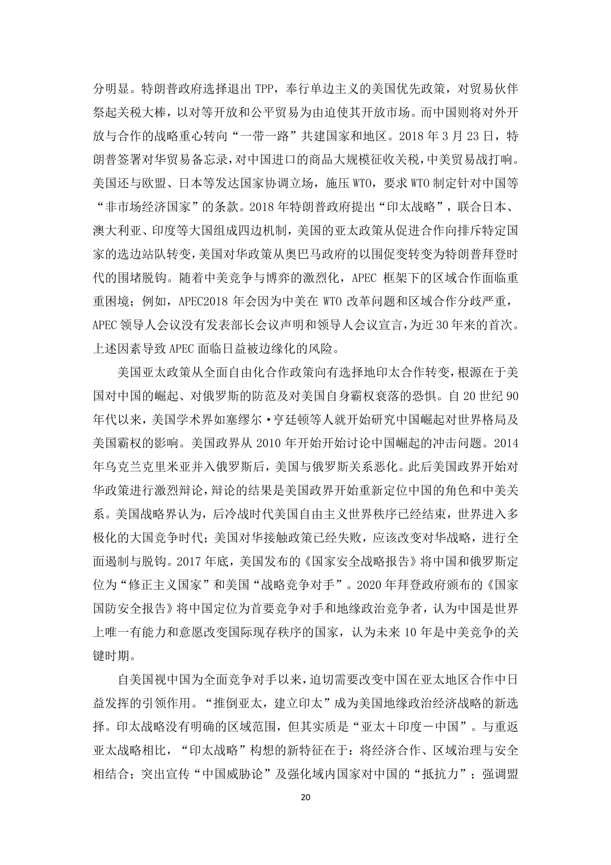 过去几十年,亚太区域经济合作蓬勃发展, 创造了举世瞩目的“亚太奇迹”,展现了亚太区 域经济合作强大的生命力。但随着跨越太平洋 两岸贸易失衡及大国竞争加剧,美国从 2010 年 重返亚太战略开始转变对华和亚太区域合作政 策,从对华接触转向遏制,从亚太合作战略转向 印太合作战略。美国的区域合作战略在一定程 度上促进区域一体化进程和填补治理赤字,但 却加剧大国竞争,破坏区域合作的协商对话基 础,甚至增加大国直接冲突的风险。亚太局势动 荡不仅危及中国外部环境,而且不符合区域内 国家对发展与稳定的共同追求。对此,就中国应 对亚太变局及推进亚太区域合作,福建社会科 学院亚太研究所与全球化智库(CCG)联合建议:
