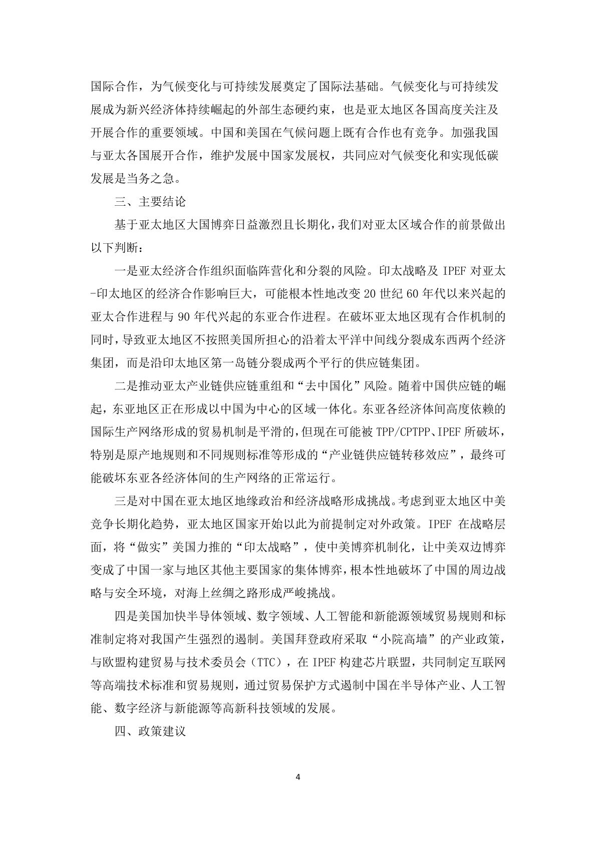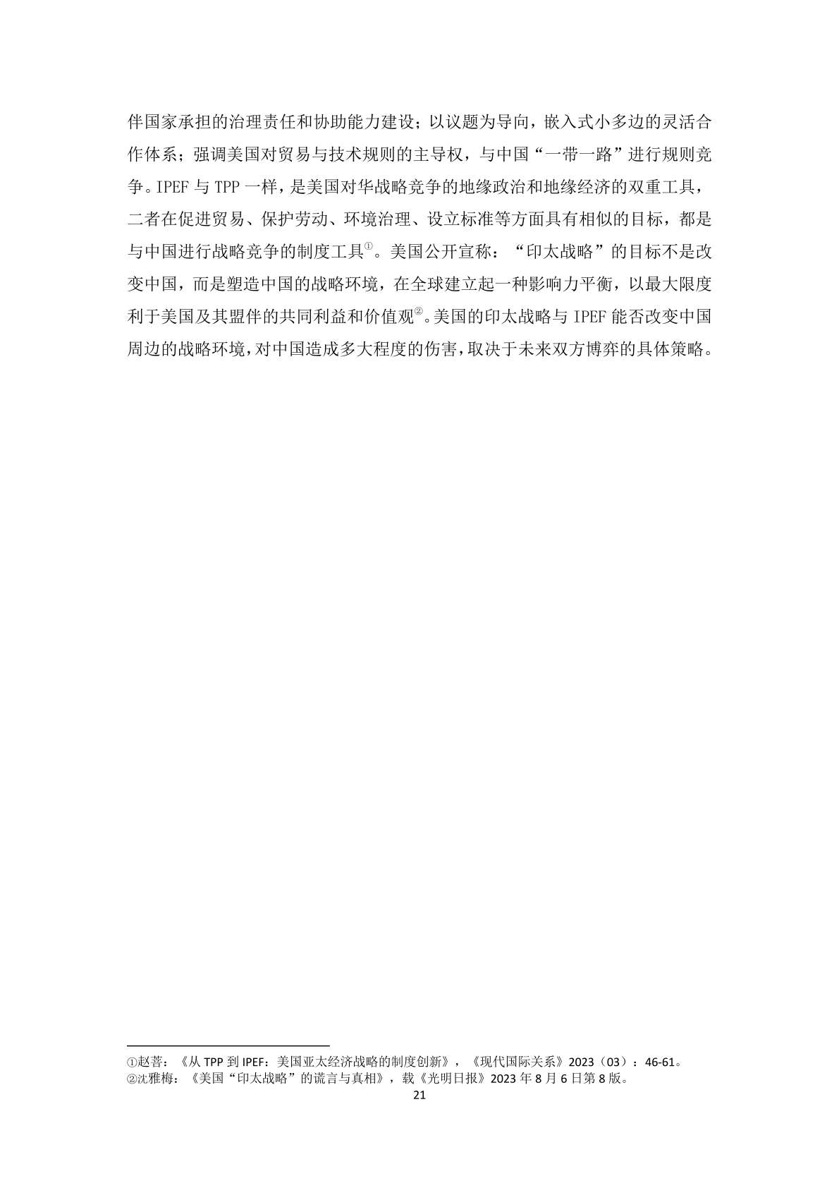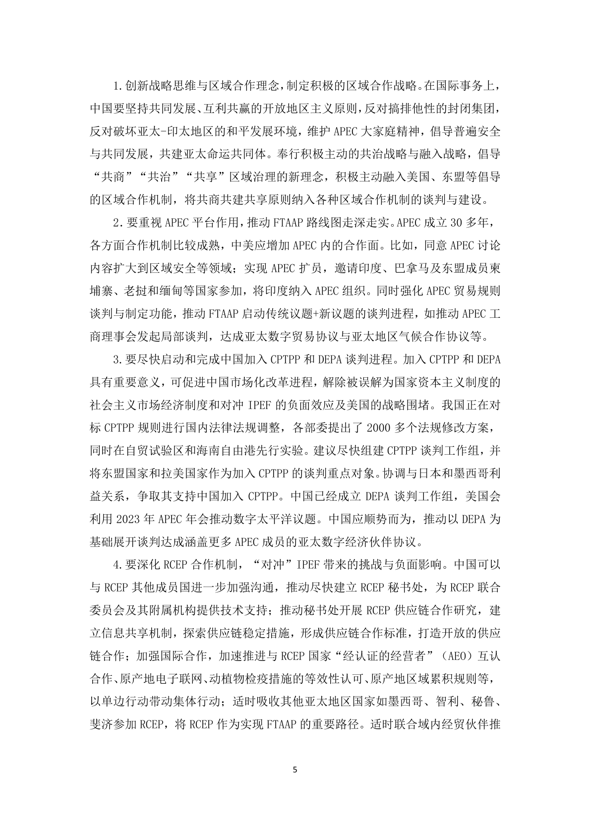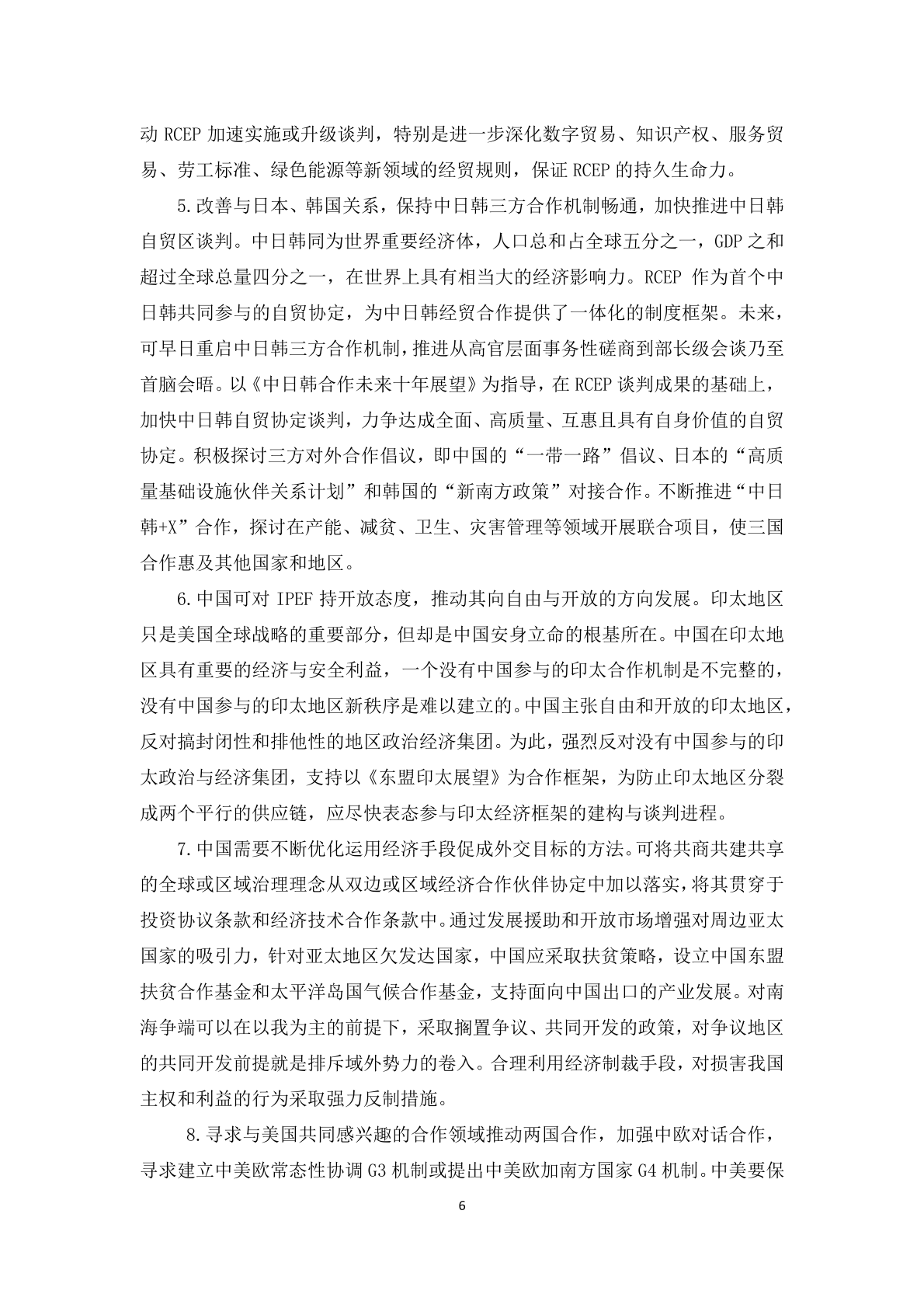 6.中国可对 IPEF 持开放态度,推动其向自由与开放的方向发展,反对搞封 闭性和排他性的地区政治经济集团,支持以《东盟印太展望》为合作框架,尽快 表态参与印太经济框架的建构与谈判进程。