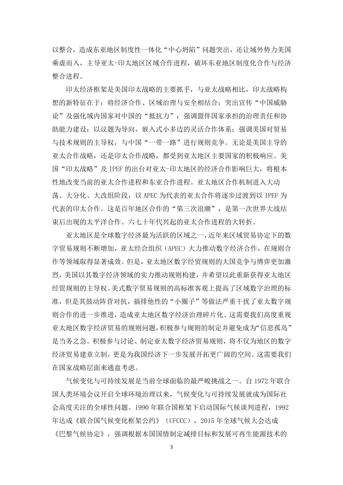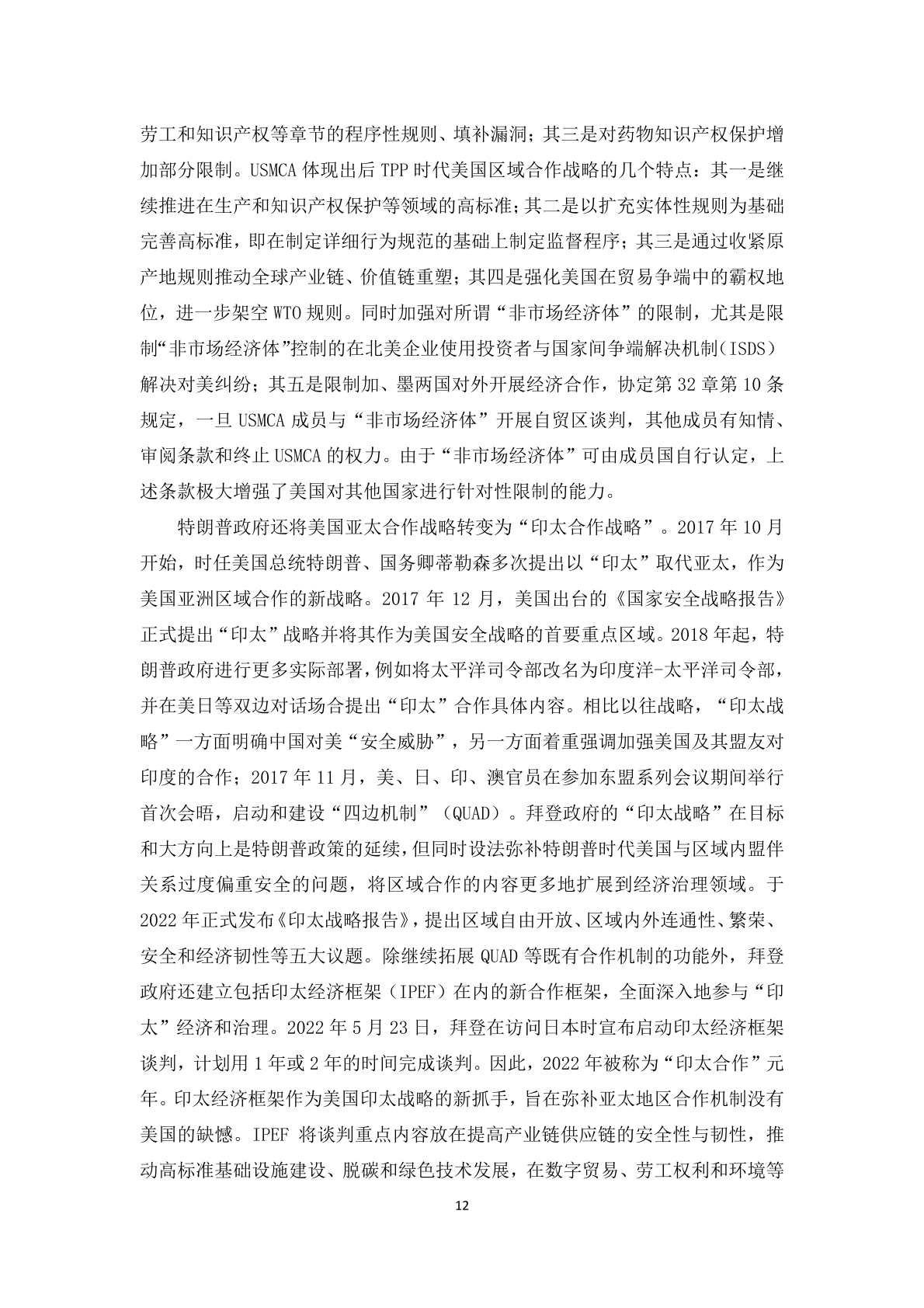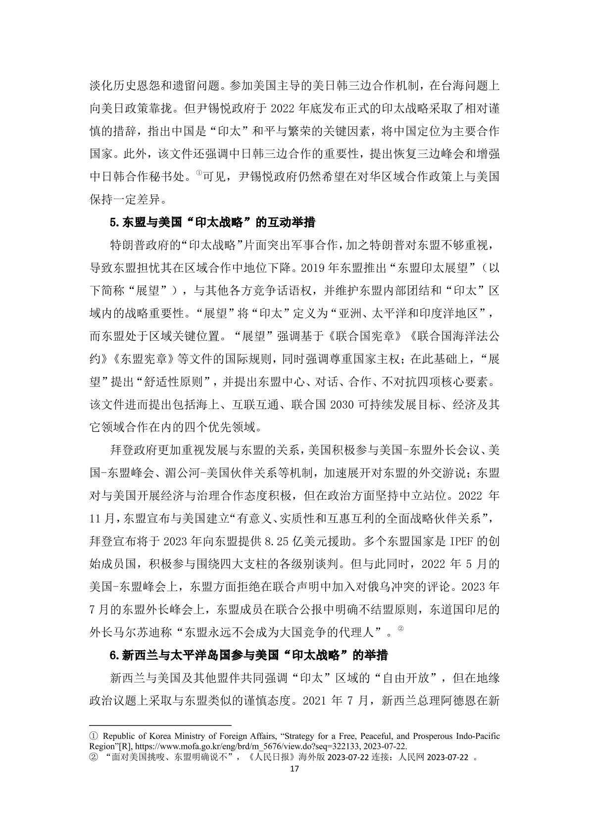 6.中国可对 IPEF 持开放态度,推动其向自由与开放的方向发展,反对搞封 闭性和排他性的地区政治经济集团,支持以《东盟印太展望》为合作框架,尽快 表态参与印太经济框架的建构与谈判进程。