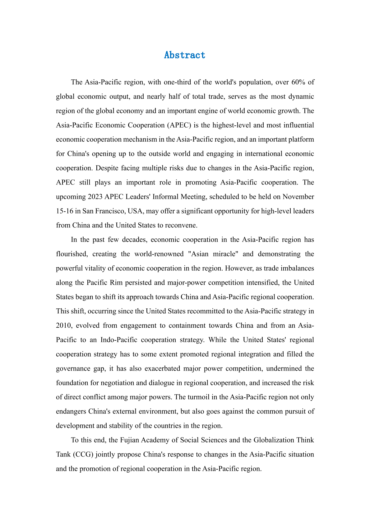 当前,亚太地区占世界人口三分之一,占世 界经济总量逾六成、贸易总量近一半,是全球经 济最具活力的地区,也是世界经济增长的重要 引擎。亚太经济合作组织(APEC)作为亚太地区 层级最高、领域最广、最具影响力的经济合作机 制,是中国对外开放与开展国际经济合作的重 要平台,尽管受亚太变局影响面临多重风险,仍 对推进亚太合作发挥着重要作用。