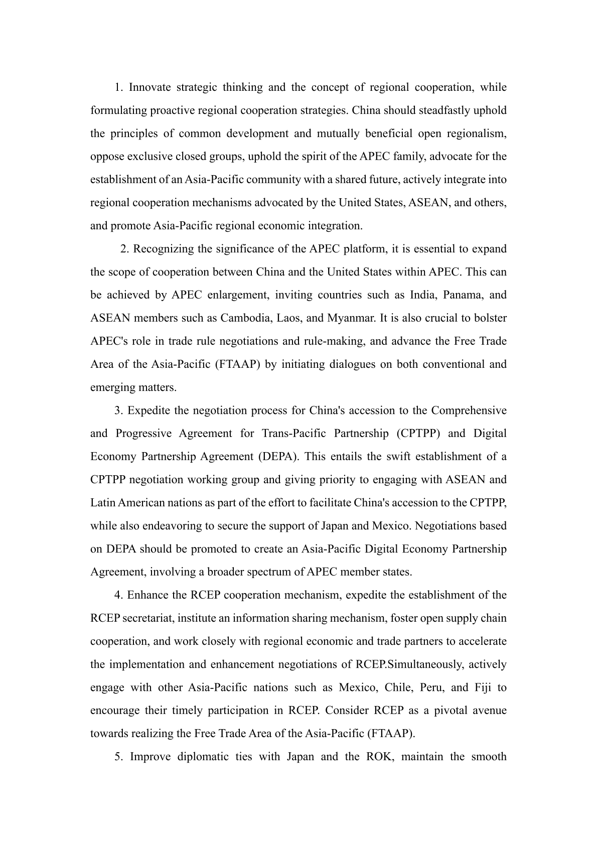 1.创新战略思维与区域合作理念,制定积极的区域合作战略。中国要坚持共 同发展、互利共赢的开放地区主义原则,反对搞排他性的封闭集团,维护 APEC 大家庭精神,倡导共建亚太命运共同体,积极主动融入美国、东盟等倡导的区域 合作机制,推进亚太区域经济一体化。