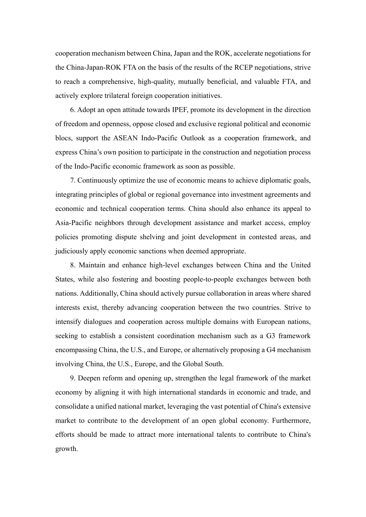 7.不断优化运用经济手段促成外交目标的方法,将共商共建共享的全球或区 域治理理念贯穿于投资协议条款和经济技术合作条款中,通过发展援助和开放市 场增强对周边亚太国家的吸引力,对争议地区采取搁置争议、共同开发的政策, 适度利用经济制裁手段。