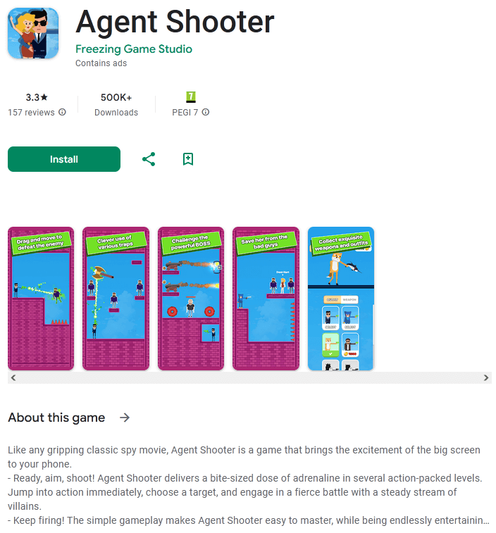 以下四款游戏,Agent Shooter, Rainbow Stretch, Rubber Punch 3D和Super Skibydi Killer被警示对设备和个人隐私有害,因为它们使用了一种旨在利用侵入式广告的木马而引人注目。其中一些游戏的下载量都超过了 500000+ 次,而且作者不遗余力地向用户隐瞒它们的邪恶。