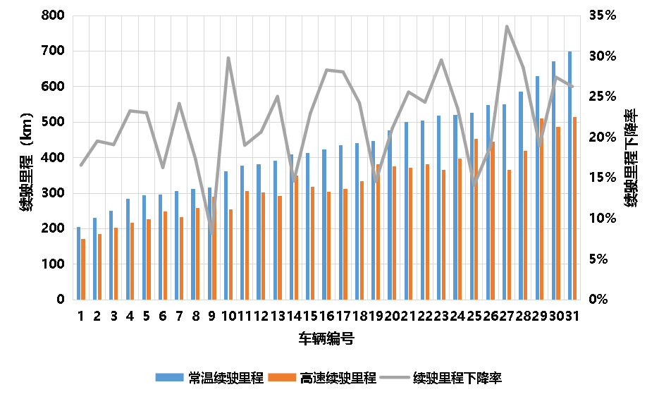 2017年至2021年间,中汽中心已经完成了对近31款车型高速续航测试评价,从30款车型续驶里程实验结果可知,常温[(23±3)℃]条件下高速续驶里程平均下降率高达22%,最高可达33%。