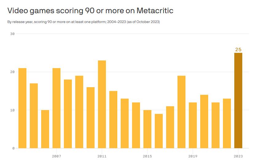 根据外媒axios报道称,在评分汇总网站 Metacritic 的数据里,2023年是过去20年里高分游戏最多的一年,共有25款游戏获得了90及以上的均分(至少一个平台),而在过去十年的大部分时间里,平均数量只有这个数字的一半。