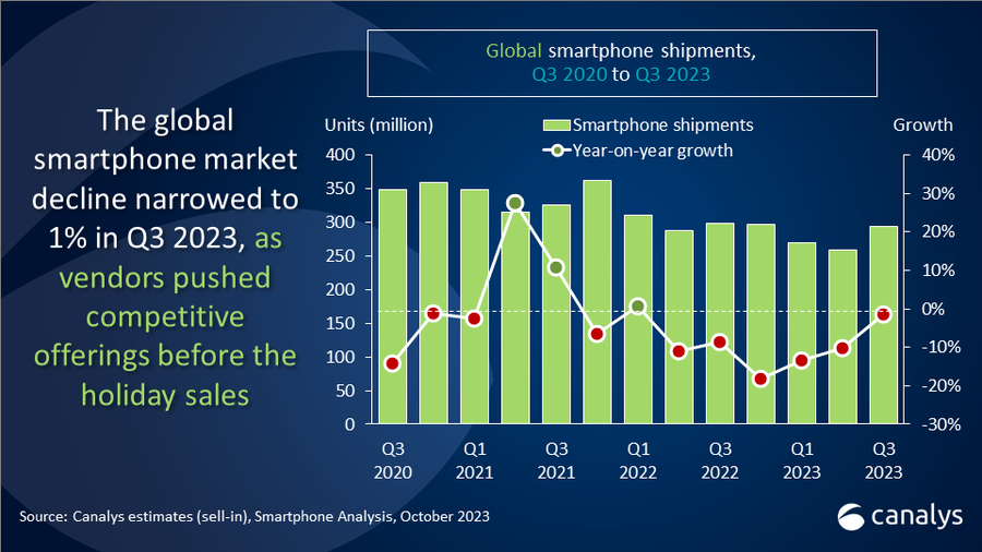 Canalys的最新研究显示,全球智能手机市场在2023年第三季度小幅下降1%,达到2.934亿台,供应商在第二季度保持健康的库存水平后推出了新机型。