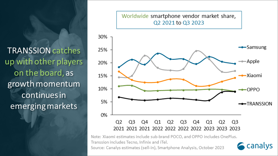 Canalys高级分析师Sanyam Chaurasia表示:“随着假日季的临近,新兴市场对新产品的需求不断上升,推动了品牌和渠道的发展。小米和传音集团保持了上一季度的强劲表现,是前五大品牌中唯一实现增长的。由于2023年上半年成功实现库存正常化,以及在新兴市场推出预算友好型系列,红米在第三季度恢复了增长势头。与此同时,在核心非洲市场出货量增加的推动下,传音实现了令人印象深刻的40%同比增长。在中东,不断增长的需求和在较不富裕市场的强大区域团队刺激了这一势头。积极的渠道投资以及新产品组合扩大了传音在拉丁美洲市场的影响力。”