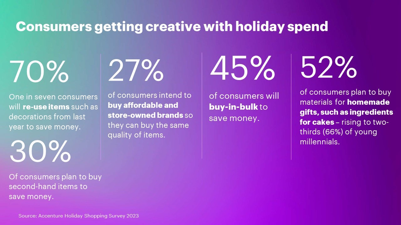 埃森哲的年度假日购物调查显示,随着零售商为假期做准备,持续的通货膨胀、高利率和收入不确定性促使许多消费者削减开支,做出权衡,并在花钱的方式、地点和内容上变得更有创意。