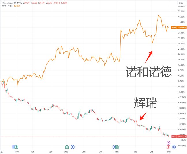 对资本市场来说,辉瑞的下一个“潜在爆点”是正在临床试验的GLP-1药物danuglipron。一旦这款药物验证有效,将使辉瑞有资格与诺和诺德、礼来站上同一条赛道争夺千亿美元市场。非常凑巧的是,减肥药龙头诺和诺德年初至今涨了接近40%,辉瑞差不多跌了40%。