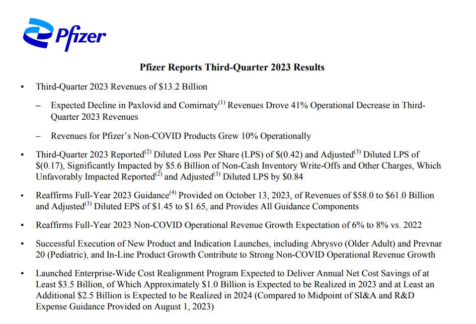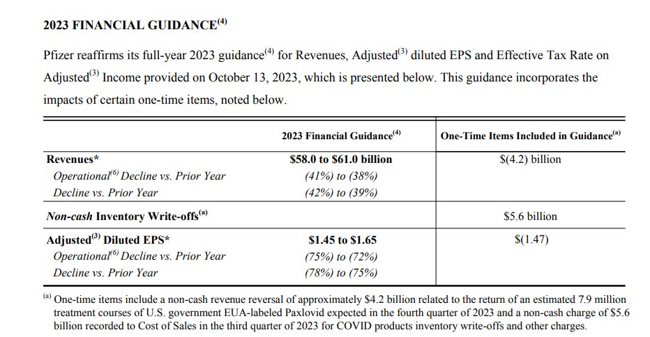 当然,本季度的亏损也与新冠药品有关。在十月中旬发布的业绩警告中,辉瑞曾表示美国政府将在2023年底退还约970万个带有“紧急使用授权”标记的Paxlovid疗程。这一情况将造成42亿美元的非现金收入逆转,并在三季报中按照库存减记和其他项目计入56亿美元的非现金费用。
