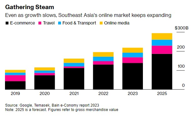调整预期的原因是这个拥有6.5亿多人口的地区的消费者正在抑制支出,以应对通胀和利率的上升。与此同时,竞争也在加剧。亚马逊(AMZN.US)和阿里巴巴(BABA.US)等全球巨头,以及地区企业Grab(GRAB.US)、Sea(SE.US)和GoTo Group都在争夺从线上零售到外卖和叫车服务的市场份额。