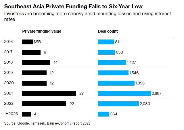 另外,随着投资者变得更加挑剔,资本变得更加昂贵,东南亚企业的私人融资已降至六年来的最低水平,较疫情期间的高点大幅放缓。报告显示,2023年上半年,该地区涉及科技公司的交易数量比上年同期减少了一半以上,降至564笔。