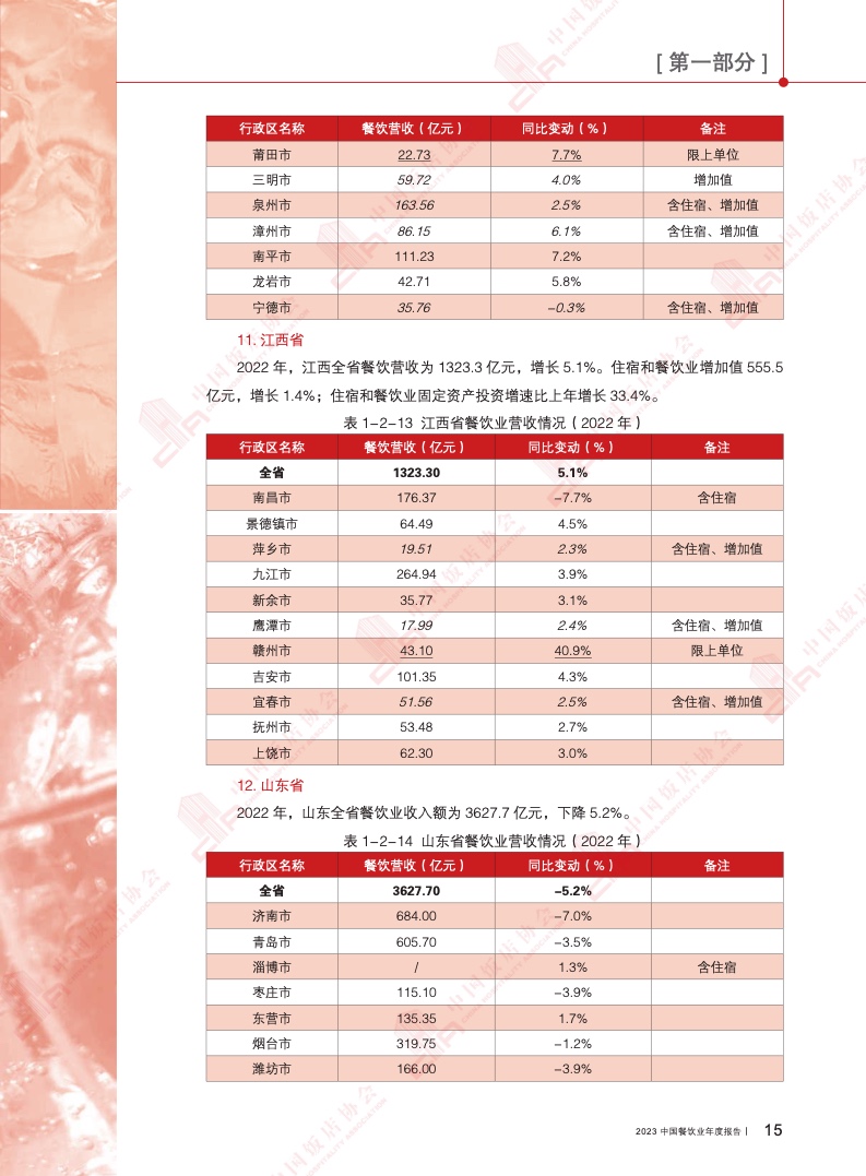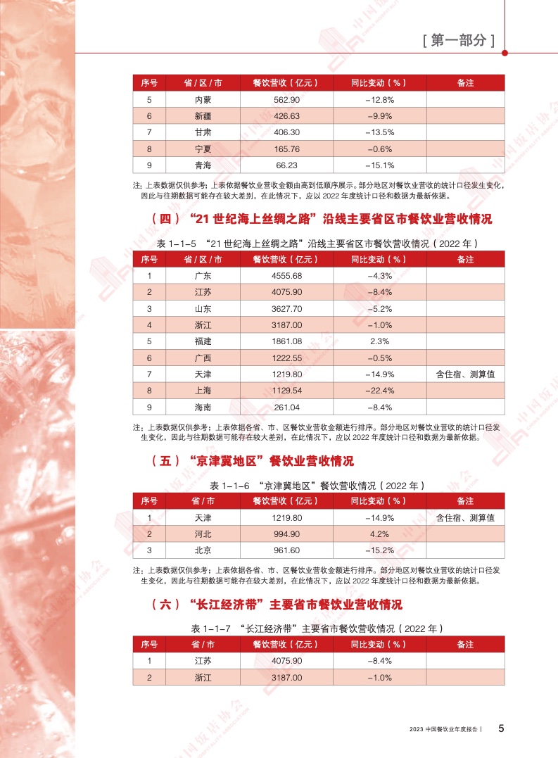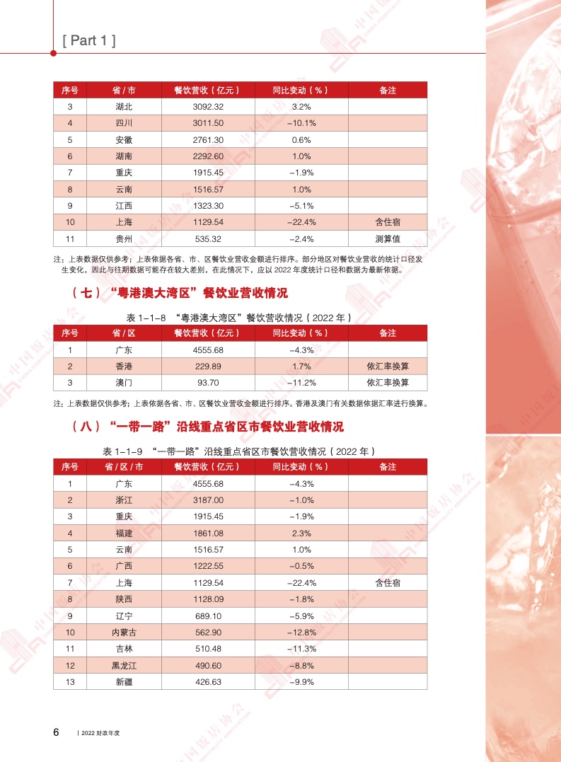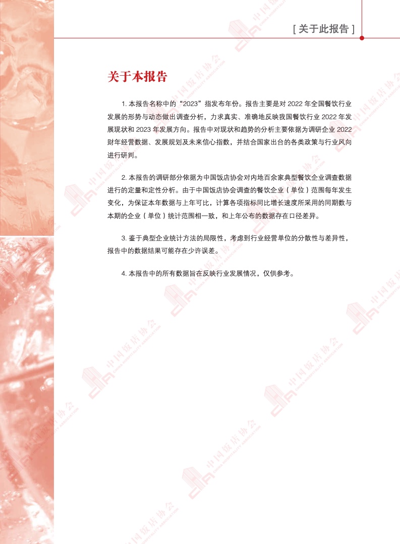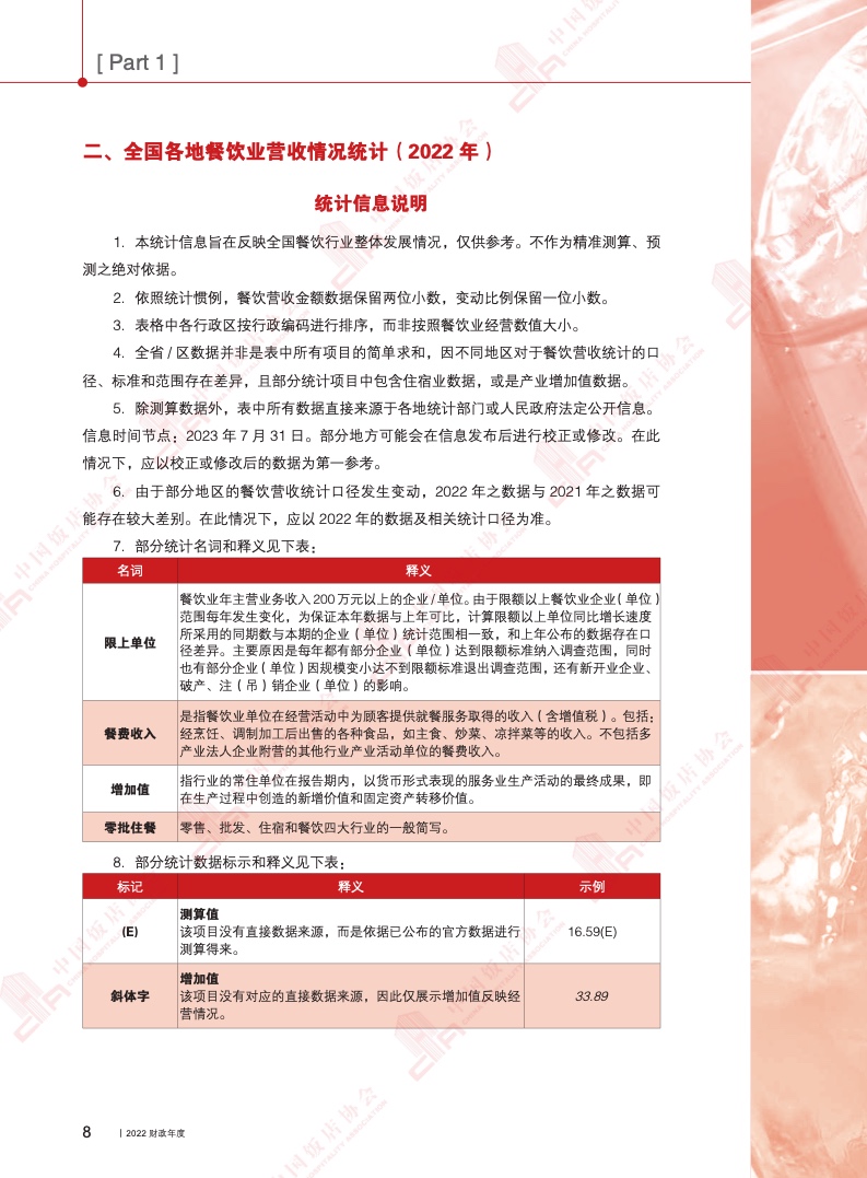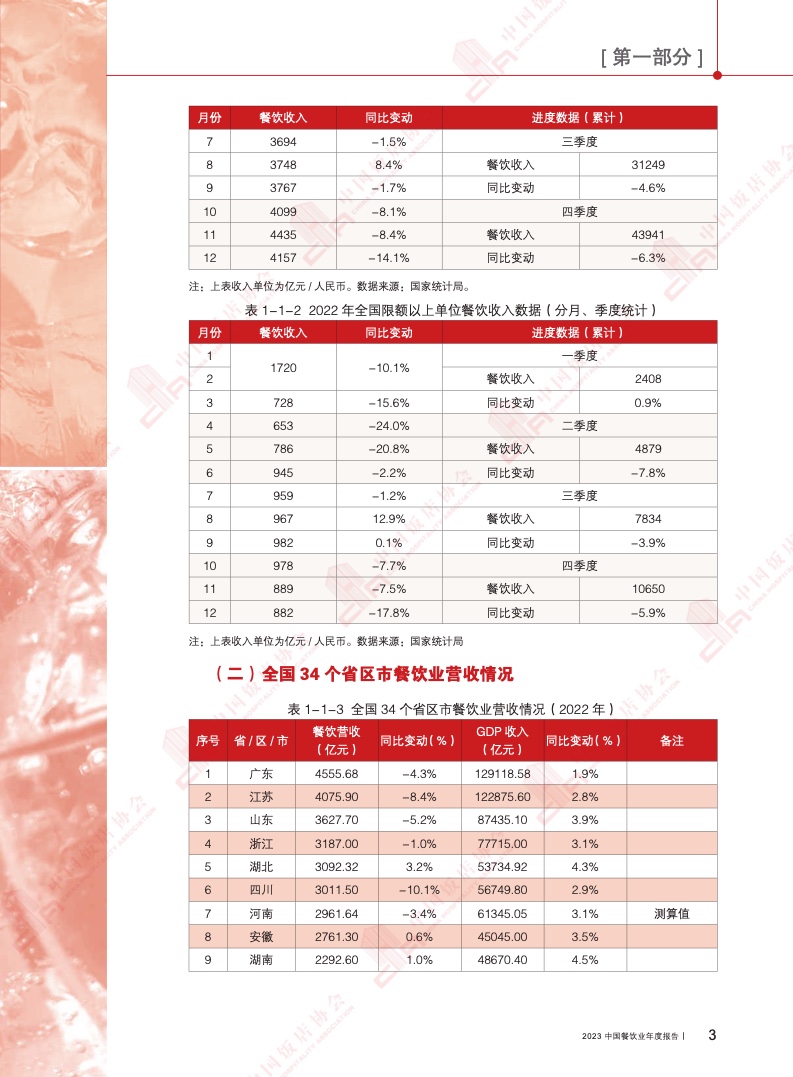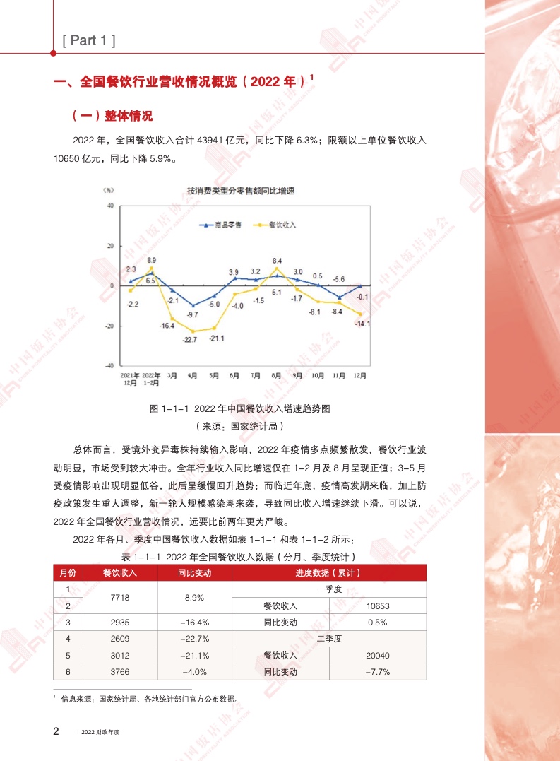 总体而言,受境外变异毒株持续输入影响,2022 年疫情多点频繁散发,餐饮行业波 动明显,市场受到较大冲击。全年行业收入同比增速仅在 1-2 月及 8 月呈现正值;3-5 月 受疫情影响出现明显低谷,此后呈缓慢回升趋势;而临近年底,疫情高发期来临,加上防 疫政策发生重大调整,新一轮大规模感染潮来袭,导致同比收入增速继续下滑。可以说, 2022 年全国餐饮行业营收情况,远要比前两年更为严峻。