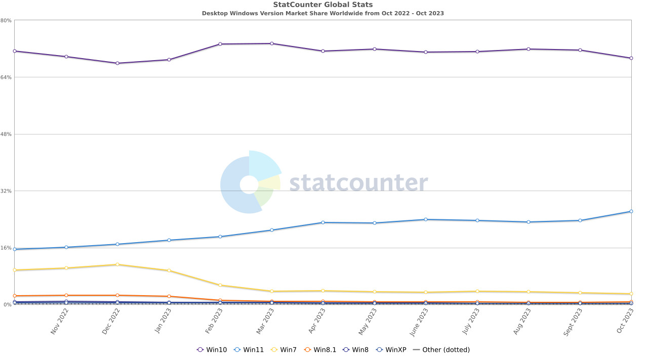 StatCounter 发布了月度报告,其中包含有关桌面操作系统、搜索引擎、浏览器等的最新数据。根据 2023 年 10 月的报告,Windows 11 的市场份额显著上升,从 9 月份的 23.64% 攀升至 2023 年 10 月的 26.14%。