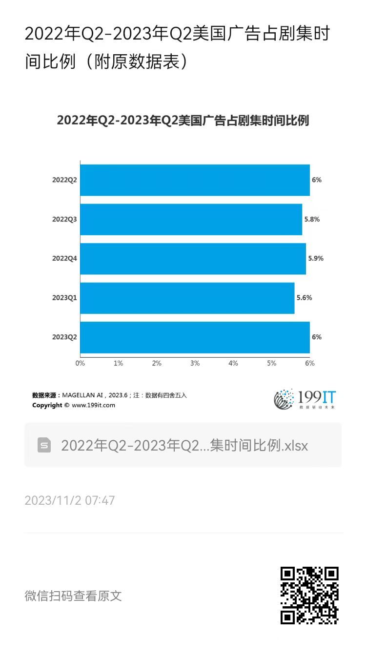 2022年Q2-2023年Q2美国广告占剧集时间比例(附原数据表) ​​​