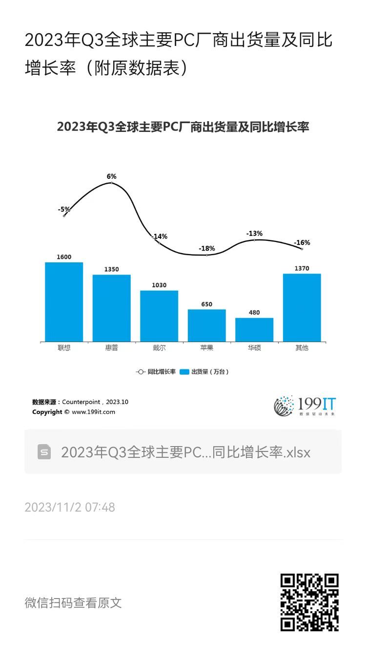 2023年Q3全球主要PC厂商出货量及同比增长率(附原数据表) ​​​