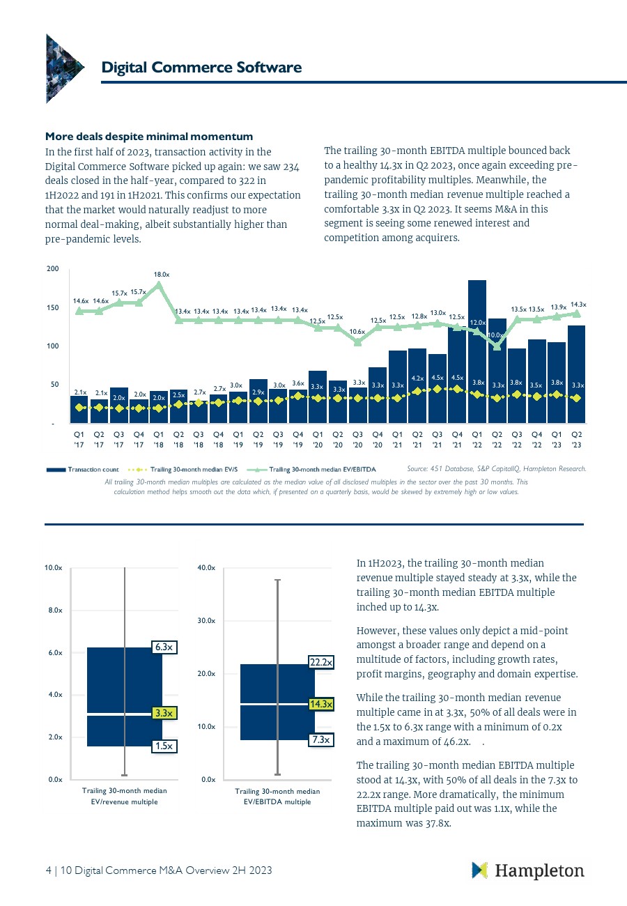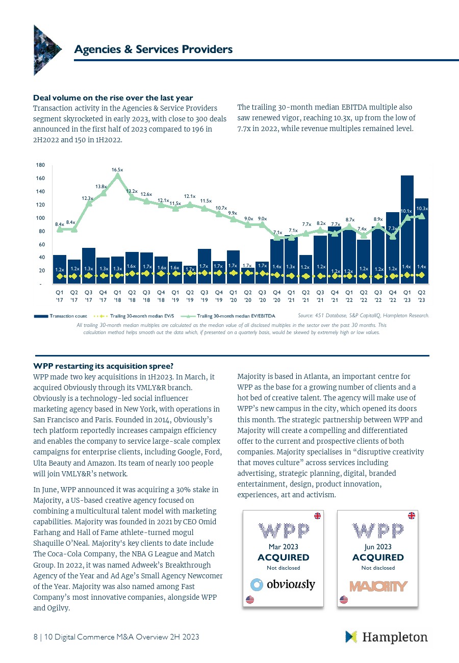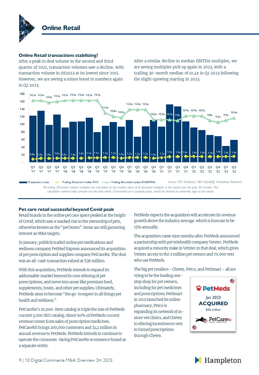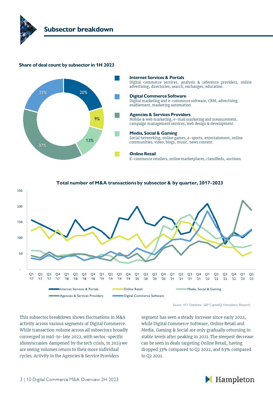 在去年同期交易数量急剧下降之后,电子商务并购交易似乎再次获得了一些动力。根据Hampleton的一项研究,从2022年第一季度的692笔高点降至去年第三季度的442笔之后,交易数量连续三个季度呈上升趋势,今年第二季度达到526笔。