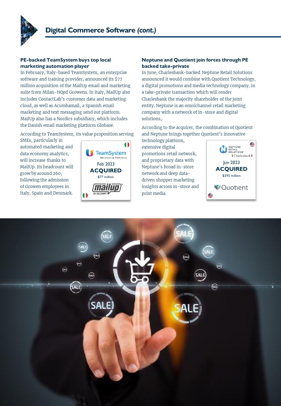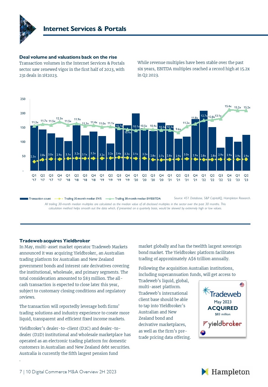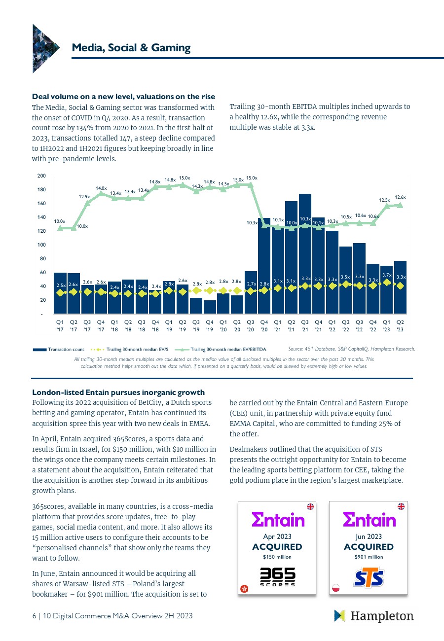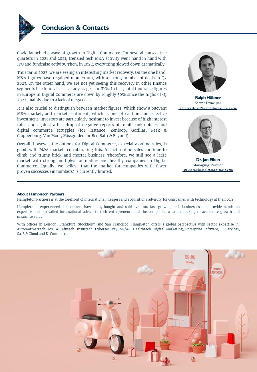 在去年同期交易数量急剧下降之后,电子商务并购交易似乎再次获得了一些动力。根据Hampleton的一项研究,从2022年第一季度的692笔高点降至去年第三季度的442笔之后,交易数量连续三个季度呈上升趋势,今年第二季度达到526笔。