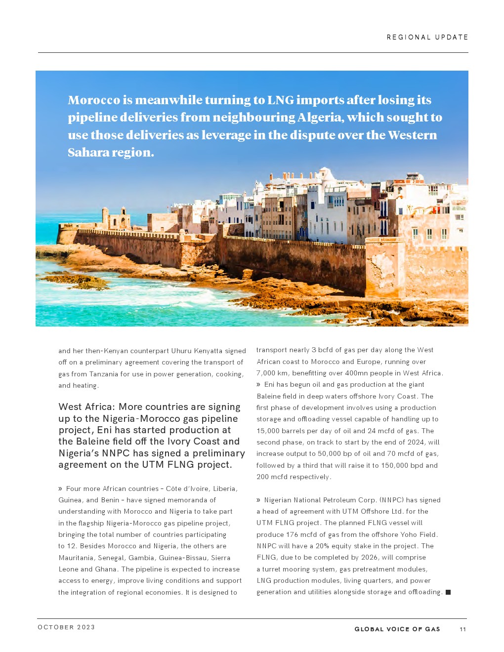 西非:越来越多的国家签署了尼日利亚-摩洛哥天然气管道项目,埃尼公司已经开始在象牙海岸附近的Baleine油田生产,尼日利亚国家石油公司已经就UTM FLNG项目签署了初步协议。