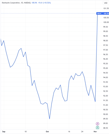 在周四公布的财报中,星巴克披露今年7至9月间的第四财季,总共实现创纪录的94亿美元营收,同比增速达到11%;净利12.19亿美元,折合每股盈余1.06美元,这两项主要财务数据均好于市场预期。